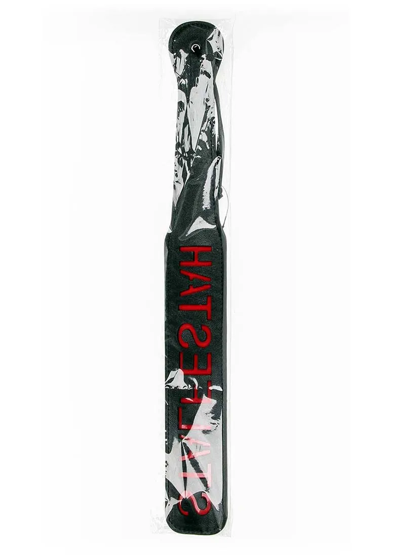 Шлепалка Ouch! С надписью HATSEFLATS - ударный девайс для эротических ролевых игр и практик БДСМ. Ударная часть имеет прямоугольную форму, плавно перетекающую в рукоять.