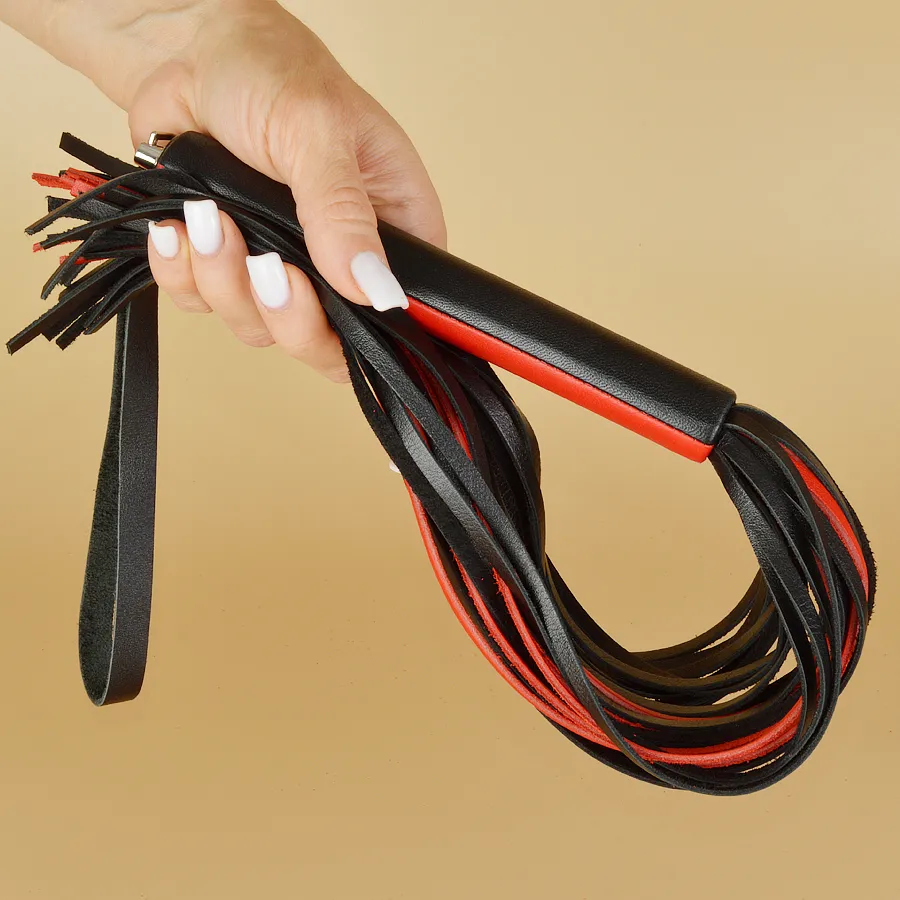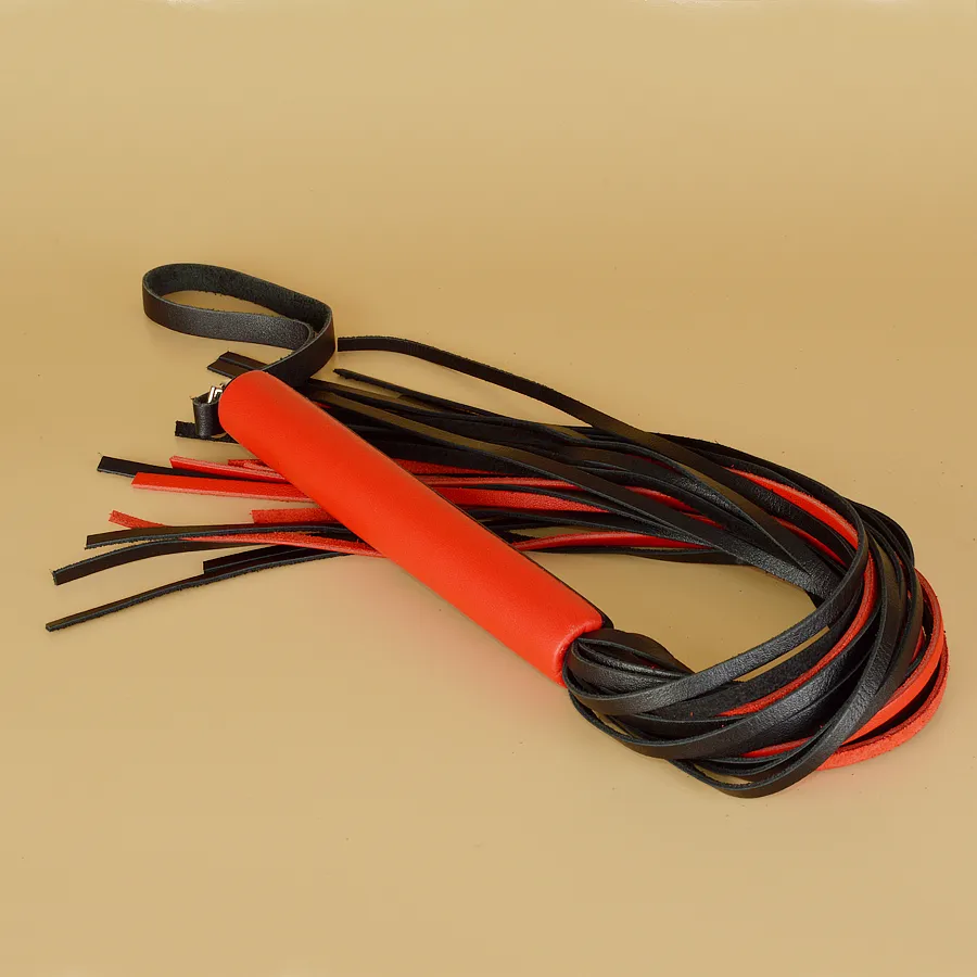 Плеть "Домино"  полностью изготовлена из натуральной  кожи красного и черного цвета. Для удобного использования на торце ручки имеется ремешок. Длина ручки – 17 см, длина ударной части 39 см. Масса нетто 150 гр.