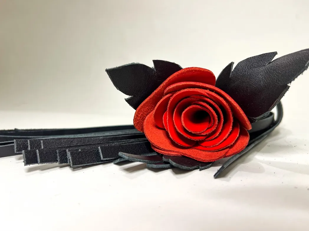 Восхитительная мини-плеть, украшенная красной розой. Цветок полностью выполнен из натуральной лаковой кожи, листочки розы,рукоятка и хвосты плети-натуральная мягкая кожа.Размеры этой плети очень изящны- общая длина всего 40см, поэтому данную плеть можно использовать, как генитальную, чтобы добавить новых ярких ощущений. Розочка очень удобно лежит в руке и создает неповторимую атмосферу и настроение, этот аксессуар никого не оставит равнодушным!