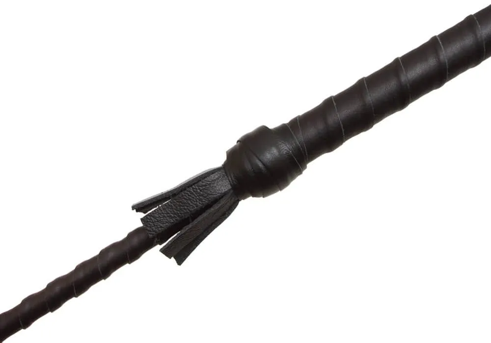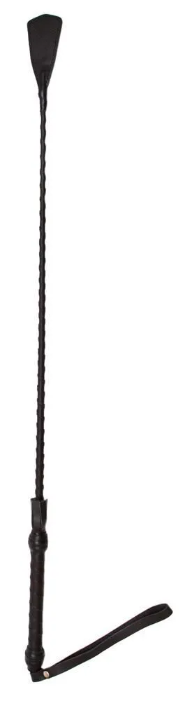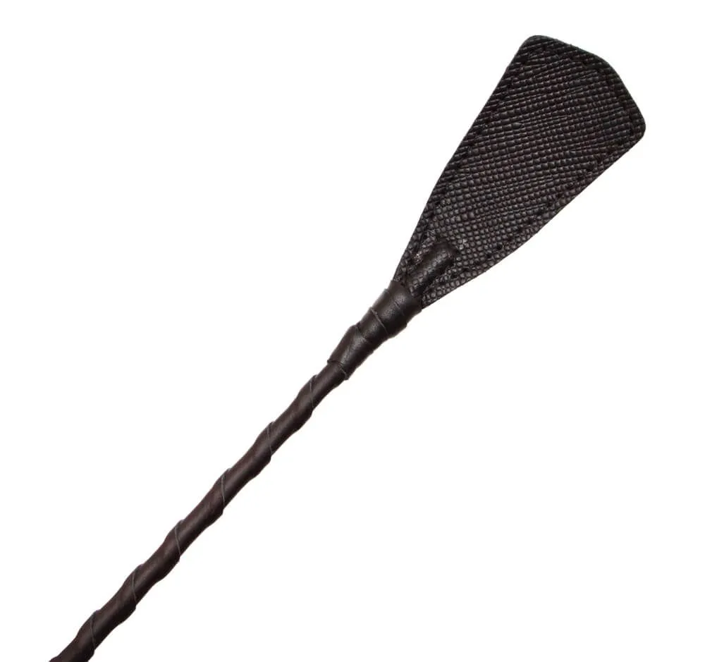 У этого стека гибкое основание, овитое черными лакированными полосками, и наконечник в виде хлопушки длиной 10 см. Также у стека есть удобная рукоять с петлей для надевания на руку.