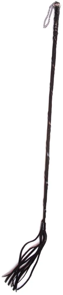 Стек выполнен из кожи черного цвета, его основание овито кожаными полосками и увенчано кисточкой со множеством хвостов. Ручка стека декорирована интересным украшением и цепочкой для его фиксации на запястье.