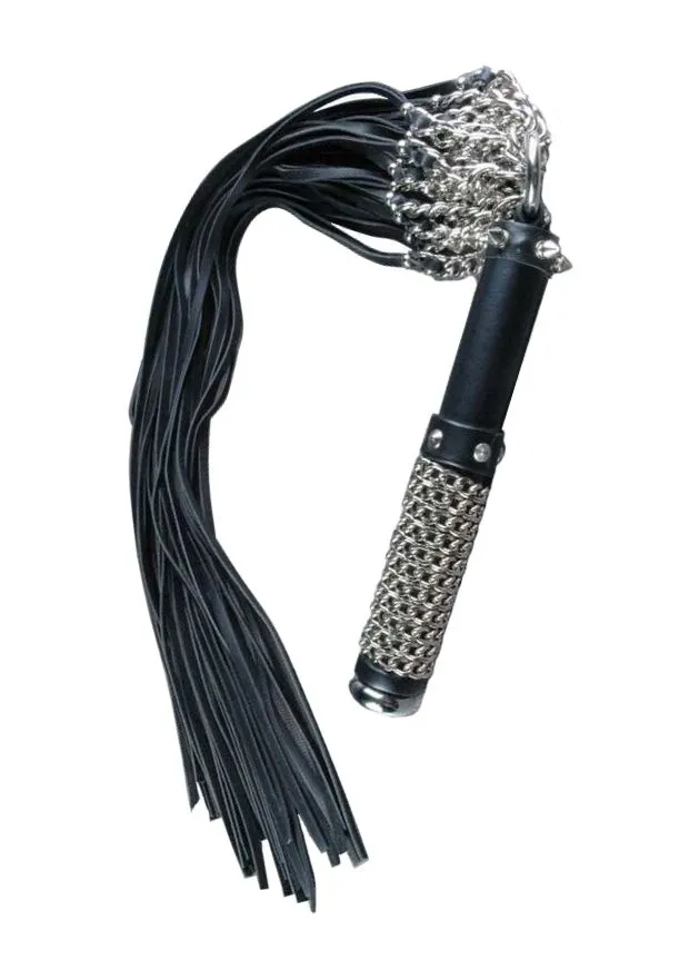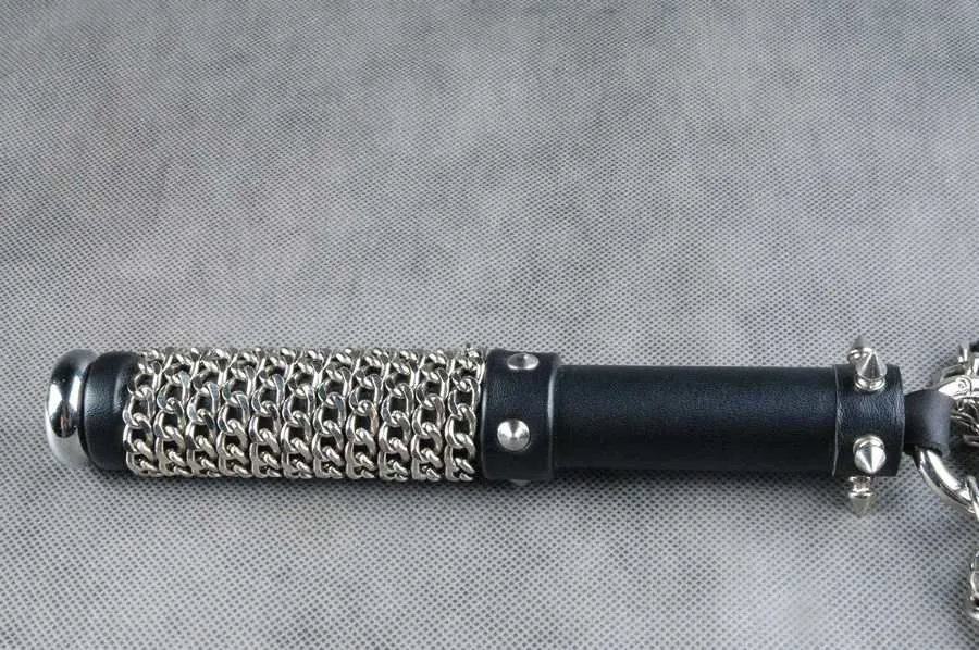 Поворотно-вращающийся флогер "Полный улет" от российского бренда Beastly сделан из натуральной кожи черного цвета и металлических цепей с алмазной гранью. Декор представлен в виде небольших шипиков. В основании рукояти - плоское металлическое навершие, место хвата обвито цепочкой. Ударная часть флогера состоит из карабинного кольца, к которому присоединены 5 пучков хвостов. Подвижность в работе обеспечивают именно цепочки с вплетенными хвостами на кольцах.