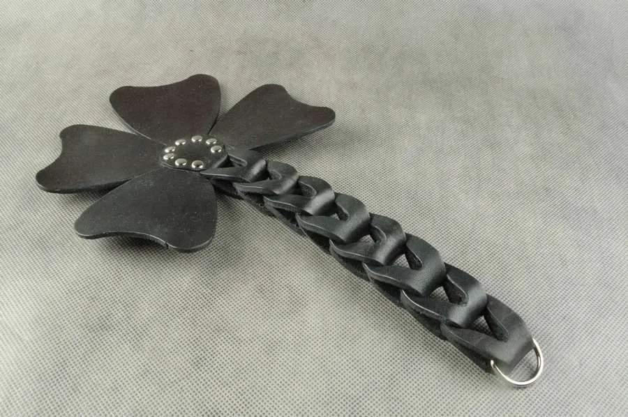 Шлепалка "Четырехлистник-2" от бренда Beastly сделана из натуральной кожи черного цвета в оригинальном дизайне в виде листа клевера и декорирована 8 металлическими клепками. Четыре ее лепестка закреплены на ручке из 8 кожаных звеньев. Наносите ей чувствительные удары по ягодицам или бедрам, которые будут сопровождаться звонкими и возбуждающими шлепками. После наказания кожа еще долго будет гореть огнем, напоминая о мучительном, но вместе с тем сладком удовольствии.