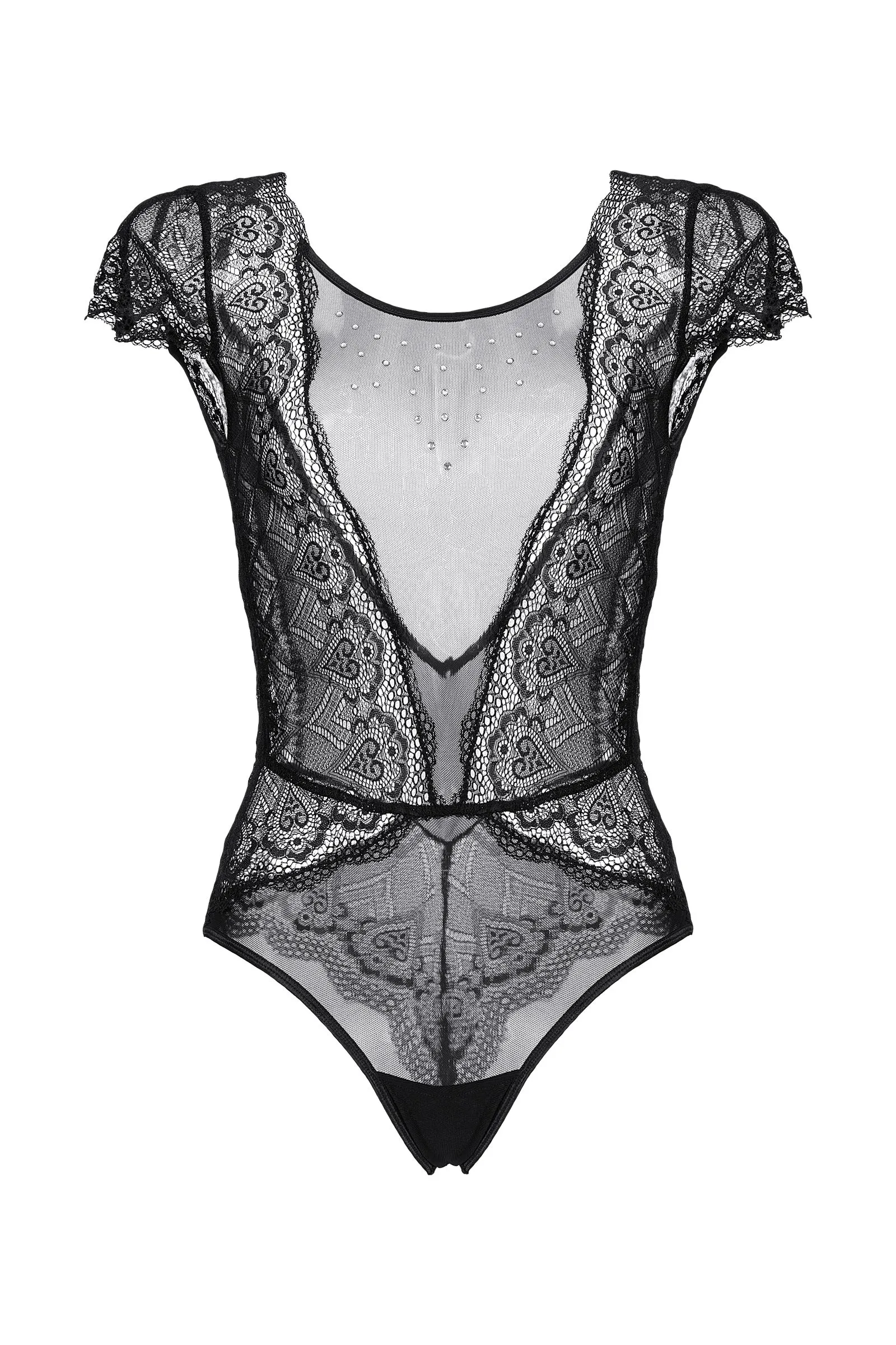 Боди со стразами Delight от Candy Girl® - для тех, кто желает увидеть откровенный восторг в глазах партнера! Приталенный силуэт, V-образный рисунок швов и шикарные кружевные вставки создают правильные визуальные акценты. Аккуратные рукава и россыпь страз на декольте добавляют интригующей игривости образу. Крой с открытой спиной и использование эластичных материалов позволяют комфортно носить и снимать боди без лишних усилий.