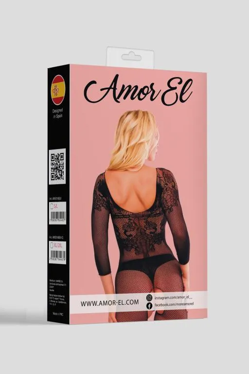 Gracia - боди-комбинезон с рукавами 3/4 и открытым доступом. Дизайн выполнен в виде сетки с кружевным рисунком. Его можно носить как полностью на плечах, так и приспустить на руки.