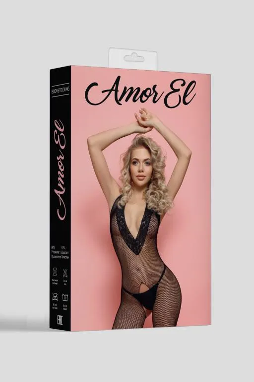 Боди-комбинезон с открытым доступом и V-образным ажурным воротником с захлестом на шею. Дизайн выполнен в виде мелкой сетки.