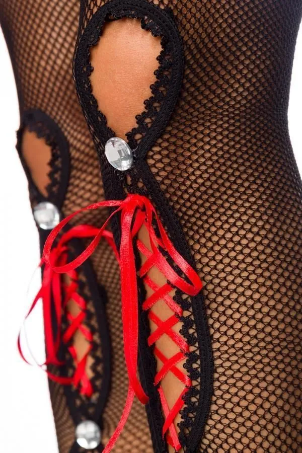 Черные чулки в сеточку от компании Atixo станут настоящим оружием соблазнения благодаря их необычному дизайну. У чулок есть длинные вырезы в области голени, декорированные красной шнуровкой из тонких атласных лент. Также они украшены сверкающими стразами, благодаря которым Ваш образ будет более роскошным. Такие чулочки с оригинальным дизайном идеально подойдут в качестве сексуального дополнения к ролевому или маскарадному костюму.