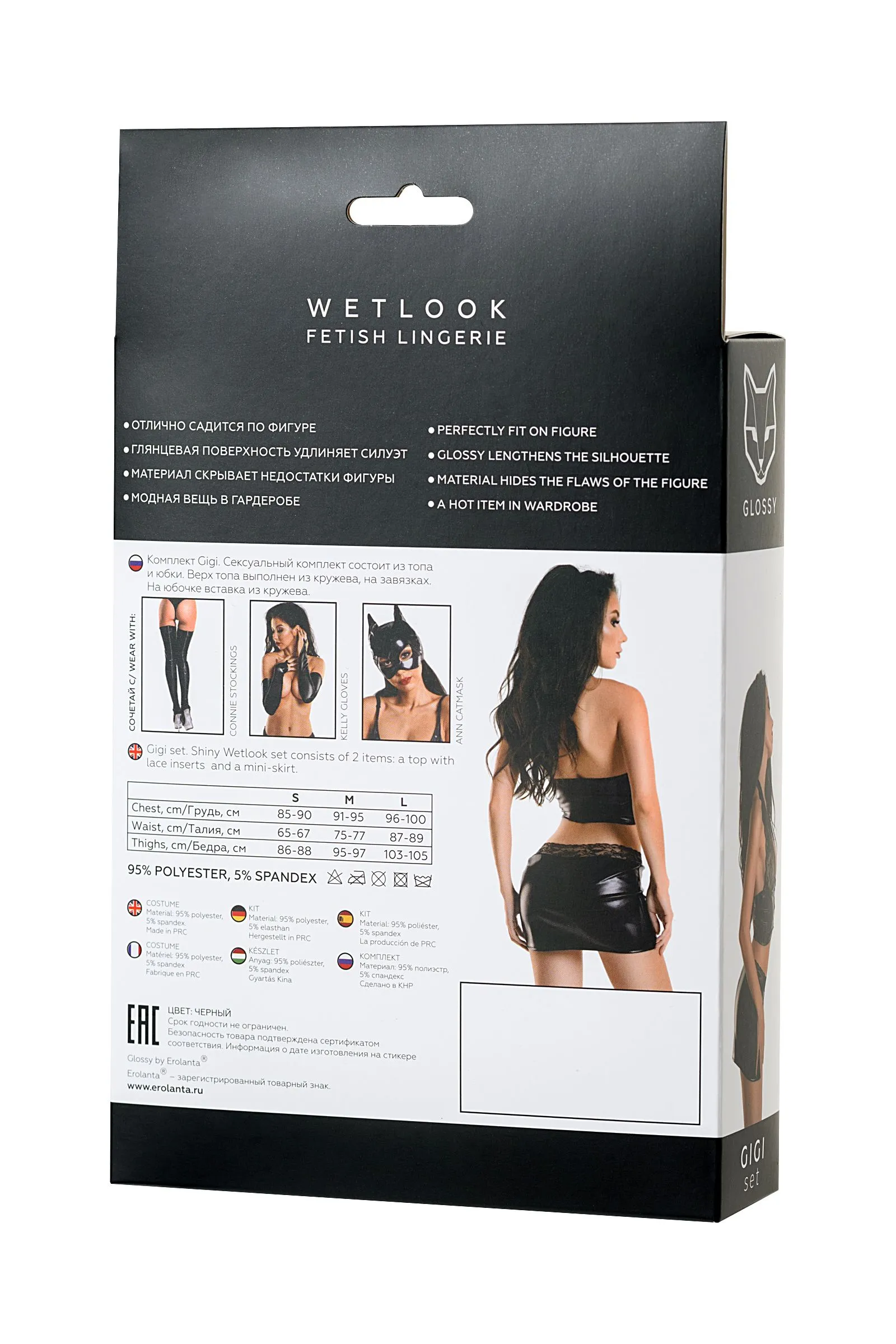 Новая коллекция белья из популярного материала Wetlook – Glossy. WETLOOK: Отлично садится по фигуре; Глянцевая поверхность визуально удлиняет силуэт; Плотный материал скроет мелкие недостатки фигуры; Модная вещь в сексуальном и базовом гардеробе. Комплект Gigi Сексуальный комплект из кружева и материала Wetlook. Верх топа выполнен из цветочного кружева, подчеркивая сексуальность декольте. Под кружевом вставка из материала Wetlook, имитирующая корсет на завяязках. На юбочке есть вставка из кружева, которая отлично дополняет образ.