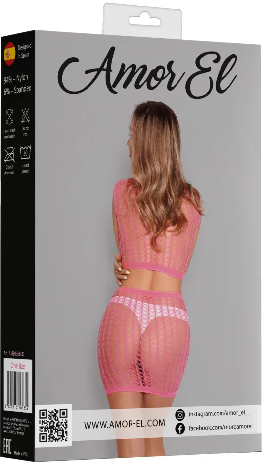 Комплект яркого и соблазнительного сетчатого белья, состоящего из полупрозрачного топа и короткой юбки.