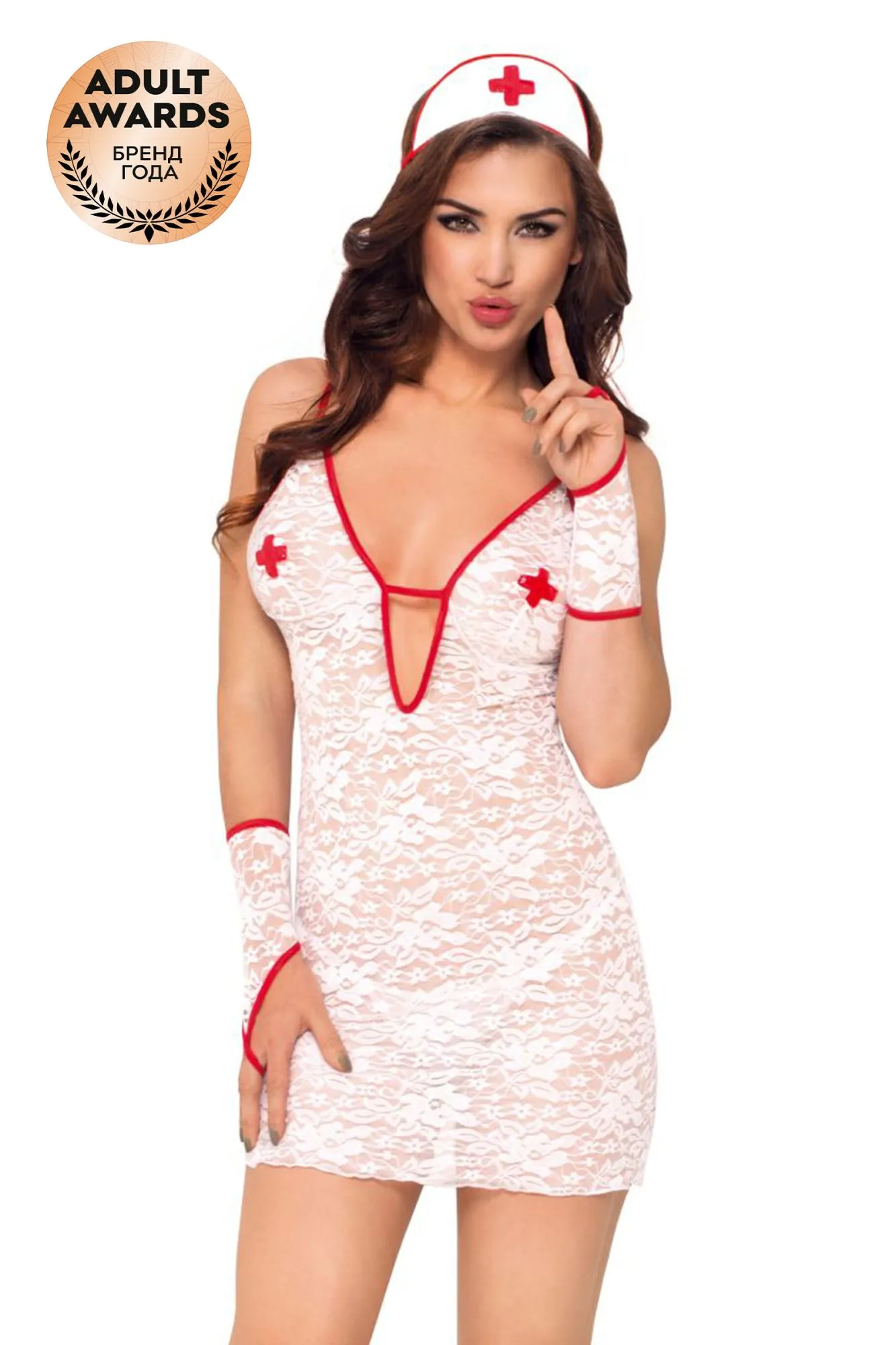 Белое кружевное платье с открытой спинкой и красными бретелями крест –накрест сзади. Спереди сексуальный вырез в районе груди. На чашках декоративные кресты. В комплекте перчатки на один палец из кружева, стринги и головной убор. Головной убор из белой непрозрачной ткани с медицинской символикой - красным крестом.