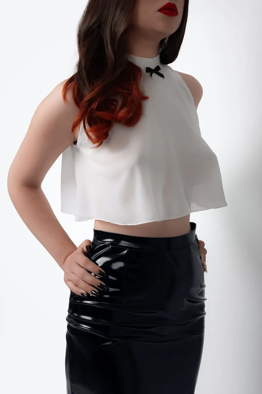 Прямая юбка из трикотажной лаковой кожи скрывает животик, даёт небольшую коррекцию силуэта, подчеркивает талию и бедра. Двусторонняя молния сзади добавляет элемент игры и позволяет открыть ягодицы для демонстрации сверху, снизу или с другого ракурса, который придет в голову. Невесомый прозрачный топ из шифона держится на паре кнопочек сзади, не сковывает движений, соблазнительно струится по телу, подчеркивает грудь и обнажает спинку. Воротник-стойка, украшенный игривым бантиком привлекает внимание к взъему груди. Каждое движение в этом легком топе будет волновать воображение и приковывать взгляд.