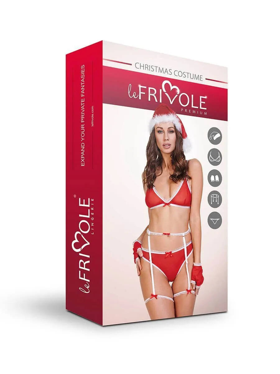 Новогодний комплект белья от бренда Le Frivole сделает праздничную ночь по-настоящему волшебной! Удивите своего партнера, представ перед ним в сексуальном костюме, состоящем из бюстгальтера, трусиков, пояса, перчаток и колпака с помпоном. Нижнее белье сделано из полупрозрачного материала красного цвета, которое не скроет фигуры. Белый пояс с подвязками, украшенный бантиками, добавит образу пикантности.
