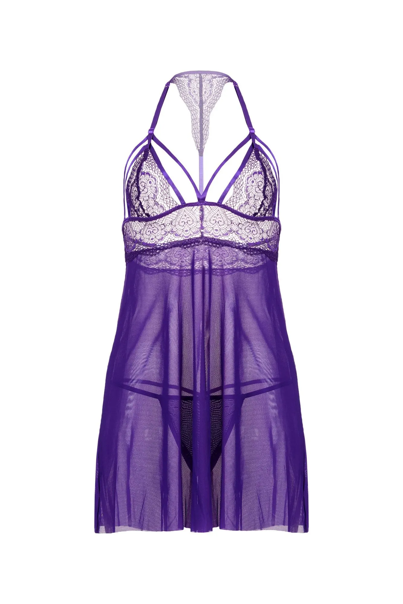 Комбинация бэби-долл Candy Girl® Nevaeh из мягкой эластичной сетки с кружевным лифом мягко струится по фигуре и визуально акцентирует внимание на груди. Декольте оформлено пикантными стрепами. Регулируемые бретели спереди и сзади создают необходимую посадку по бюсту. Дополнительный кружевной элемент на спинке добавляет пикантности образу. В комплект входят Т-стринги из эластичной сетки.