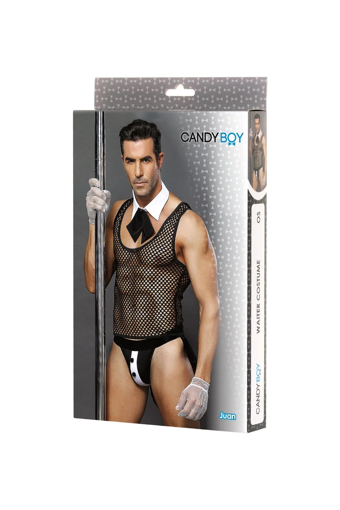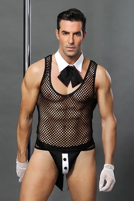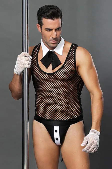 Костюм официанта Candy Boy® Juan создает волнующий образ для подачи кофе в постель! Майка с глубоким вырезом из крупной сетки подчеркивает рельеф грудной клетки. Воротник на кнопке, декорированный галстуком-бантом, расстегивается одним движением руки. Трусы-джоки (с открытыми ягодицами) и откидывающимися фалдами на широких эластичных резинках делают образ незабываемым. Контрастный декор и пуговицы грамотно расставляют акценты. Сетчатые перчатки входят в комплект.