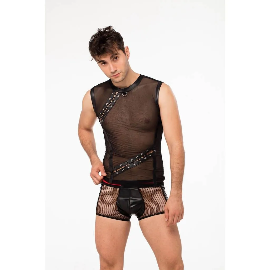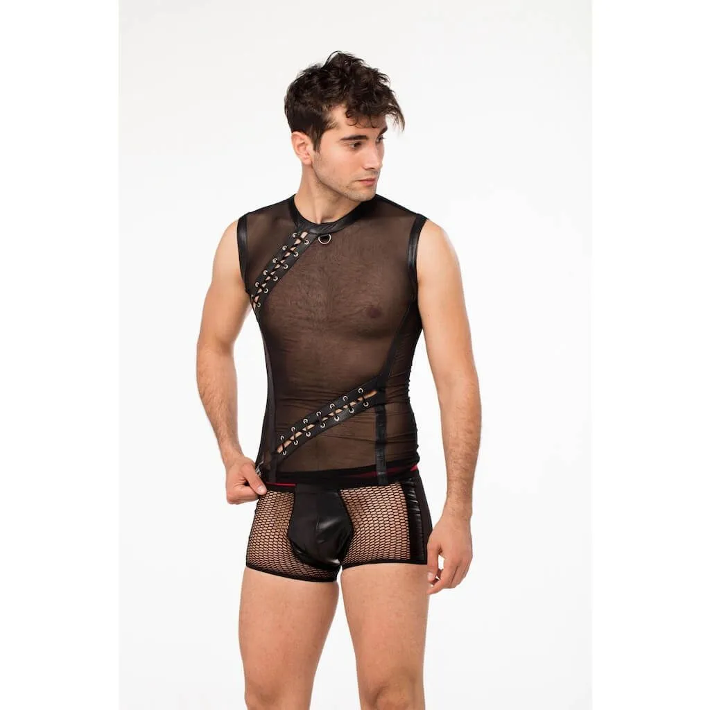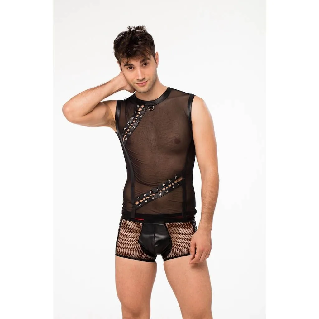 Мужская футболка от бренда Lapin Rose выполнена из прозрачной микросетки и натуральной кожи черного цвета. Ее необычный дизайн с элементами шнуровки сразу привлечет к себе внимание и придаст Вашему образу эффектности. Благодаря прозрачности материала, футболка почти не скроет тела, позволяя Вашей партнерше любоваться Вами. На горловине есть небольшое металлическое полукольцо, которое очень пригодится во время ролевых игр, ведь к нему можно присоединить поводок или другие бондажные аксессуары при помощи карабина.