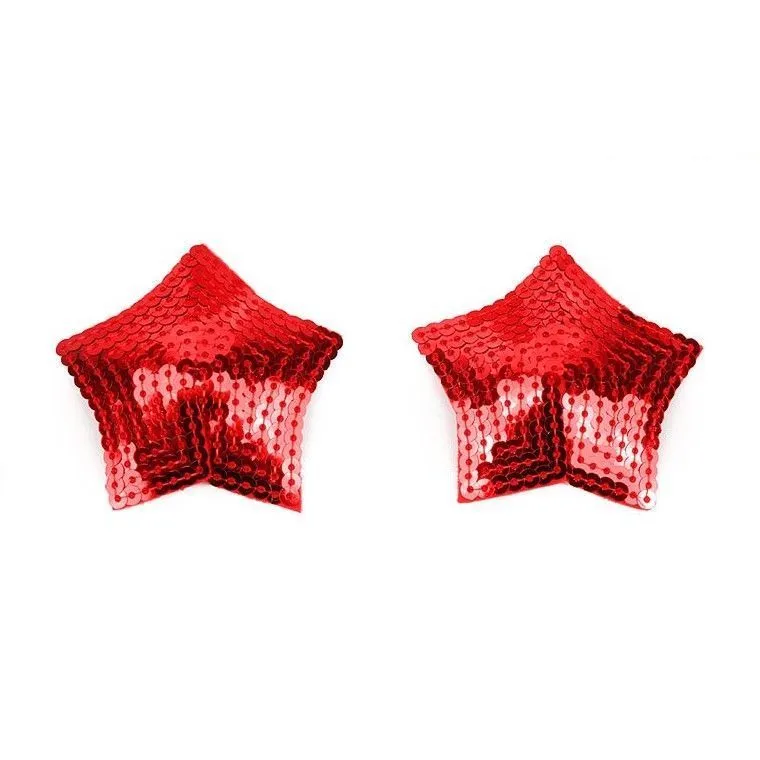 Красные блестящие пестисы на грудь в форме звёздочек с пайетками. Добавят изюминку в любовную игру, украсят соски, сделав грудь привлекательной и манящей. Внешняя сторона изделий отделана пайетками. На внутренней имеется специальный силиконовый слой, за счёт которого аксессуары держаться на сосках.