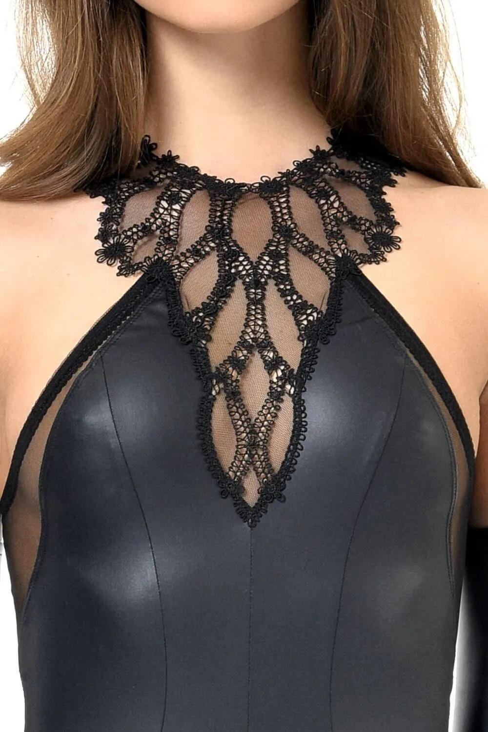 Элегантное платье Priscilla из коллекции 14.2 от французского модельера Patrice Catanzaro выполнено из плотного черного материала, имитирующего кожу, и вставок из микросетки. Короткое платье будет плотно облегать фигуру, волнительно очерчивая все ее соблазнительные изгибы. Область декольте и высокий ворот декорированы прекрасной вышивкой, добавляющей образу чувственности. А сзади переплетение бретелек, соединенных металлическими колечками, создает выразительный узор. Все бретельки регулируемые.