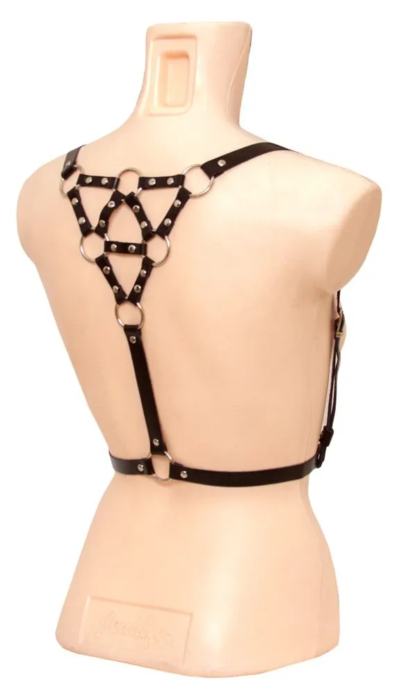 Спереди портупея выглядит достаточно просто и незатейливо, однако на спине переплетение полосок кожи и металлических колец создает красивый узор в виде треугольника, приковывающий к себе внимание. Ремни регулируются по длине, поэтому Вы сможете подогнать портупею под свой размер.