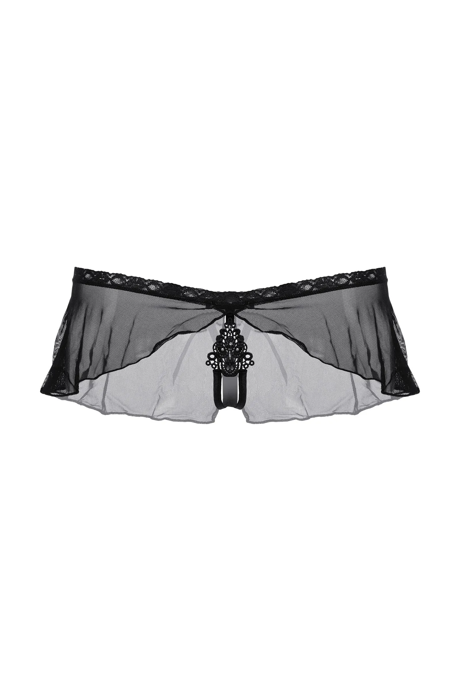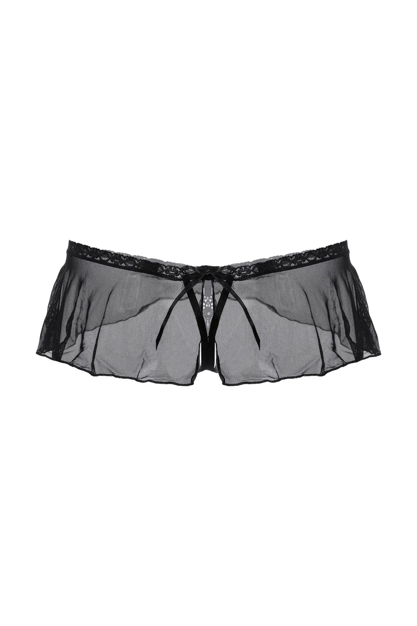 Оригинальные трусики с открытым доступом. Нежное кружево, необычный углубленный верхний край, легкий струящийся тюль и кокетливый бантик сзади создают обольстительный образ.
