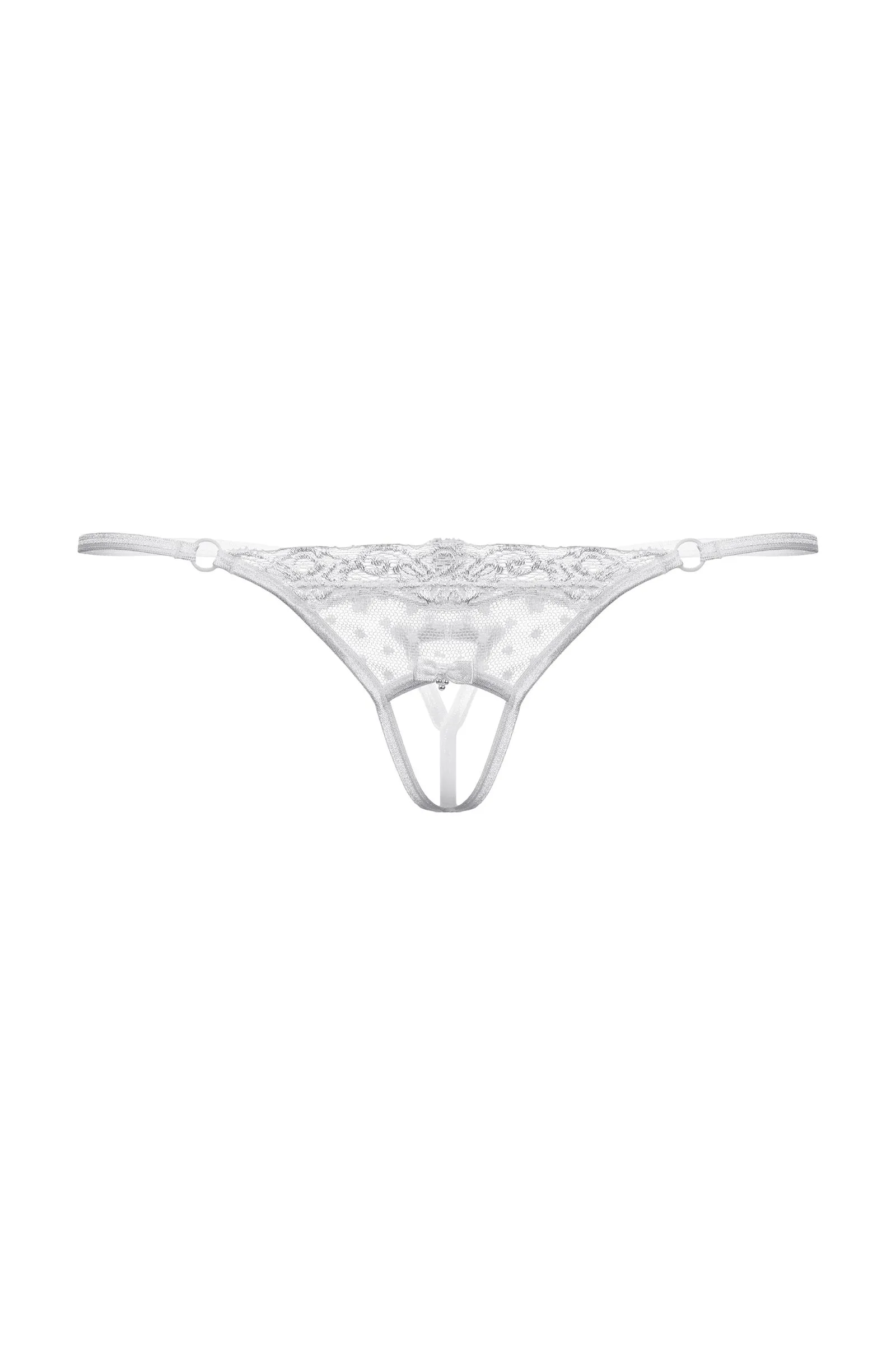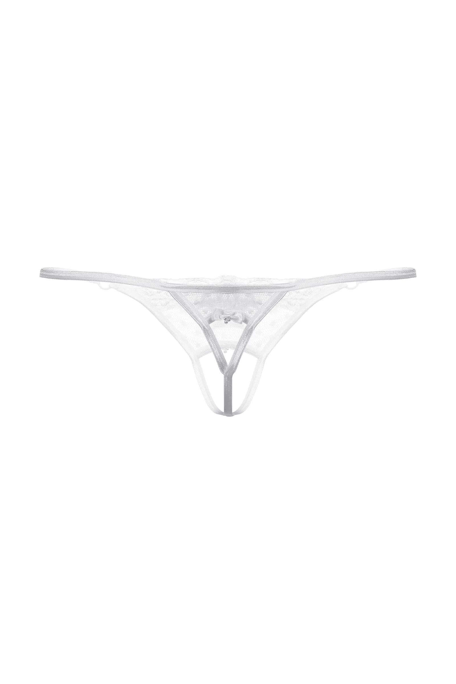 Оригинальные миниатюрные трусики с открытым доступом. Трусики выполнены из сочетания кружева и тюля, декорированы двумя игривыми бантиками, украшенными маленькими бусинами.