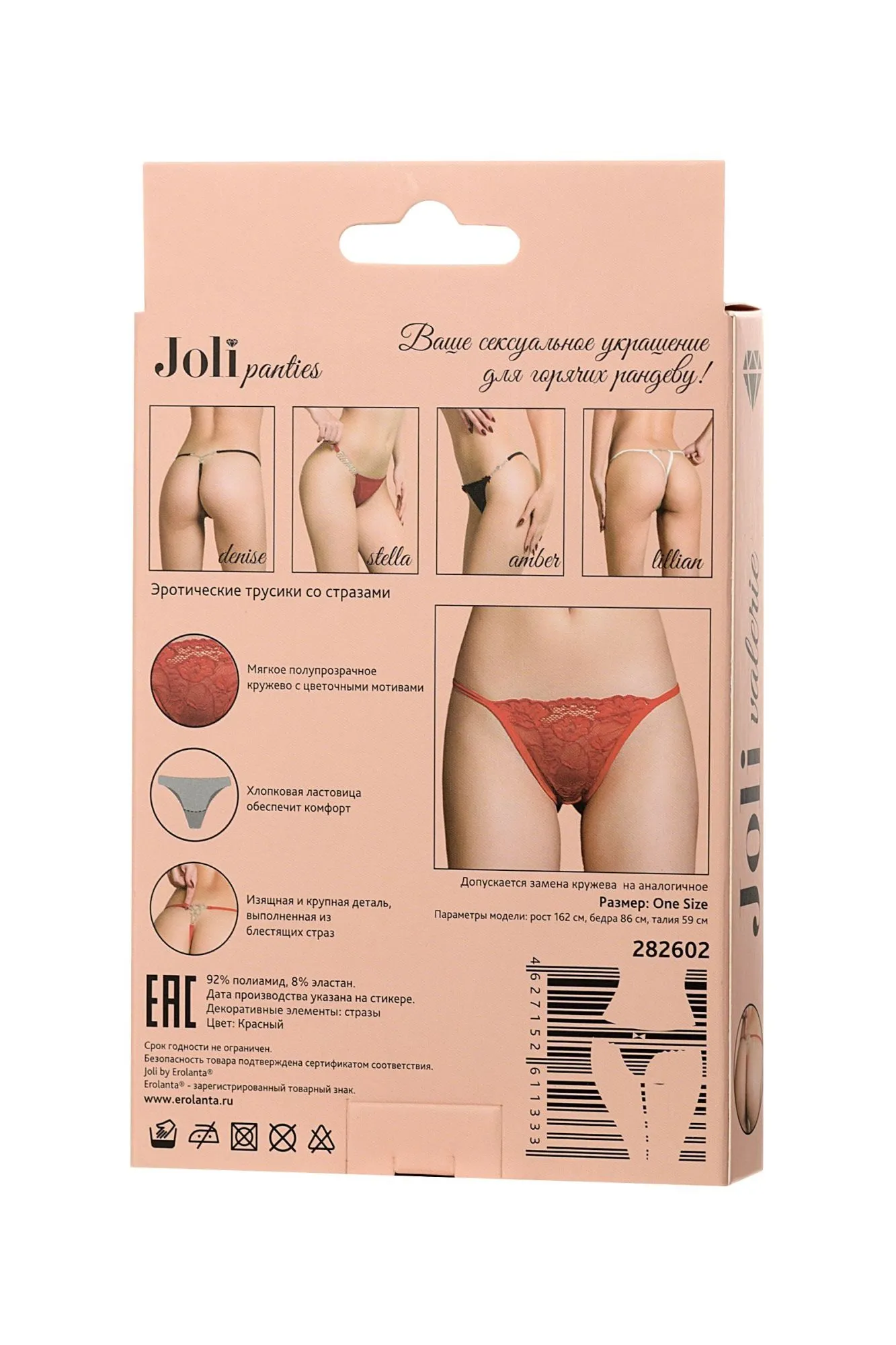 Joli panties – ваше сексуальное украшение для горячих рандеву! Новая линейка романтичного белья Joli (в пер. с французского красивая) радует глаз элегантными деталями и нежными материалами европейского качества. Мягкое и роскошное цветочное кружево спереди. Хлопковая ластовица и мягкие лямки обеспечивают комфорт.У основания ягодиц изящная и крупная деталь, выполненная из блестящих страз. Joli panties – выбери украшение для обольщения!