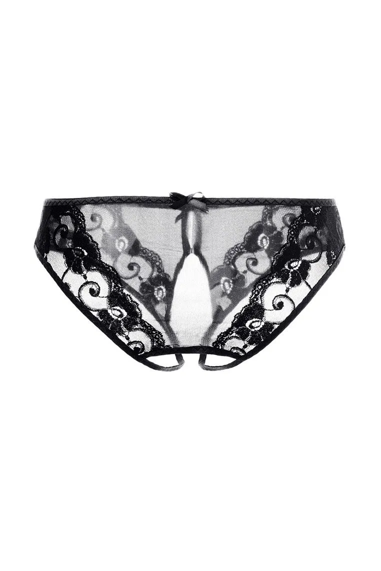 Эротические трусики Erolanta Pauline из стрейч-сетки, эластичные, с декоративным вырезом, с кружевными вставками, с атласным бантиком спереди.