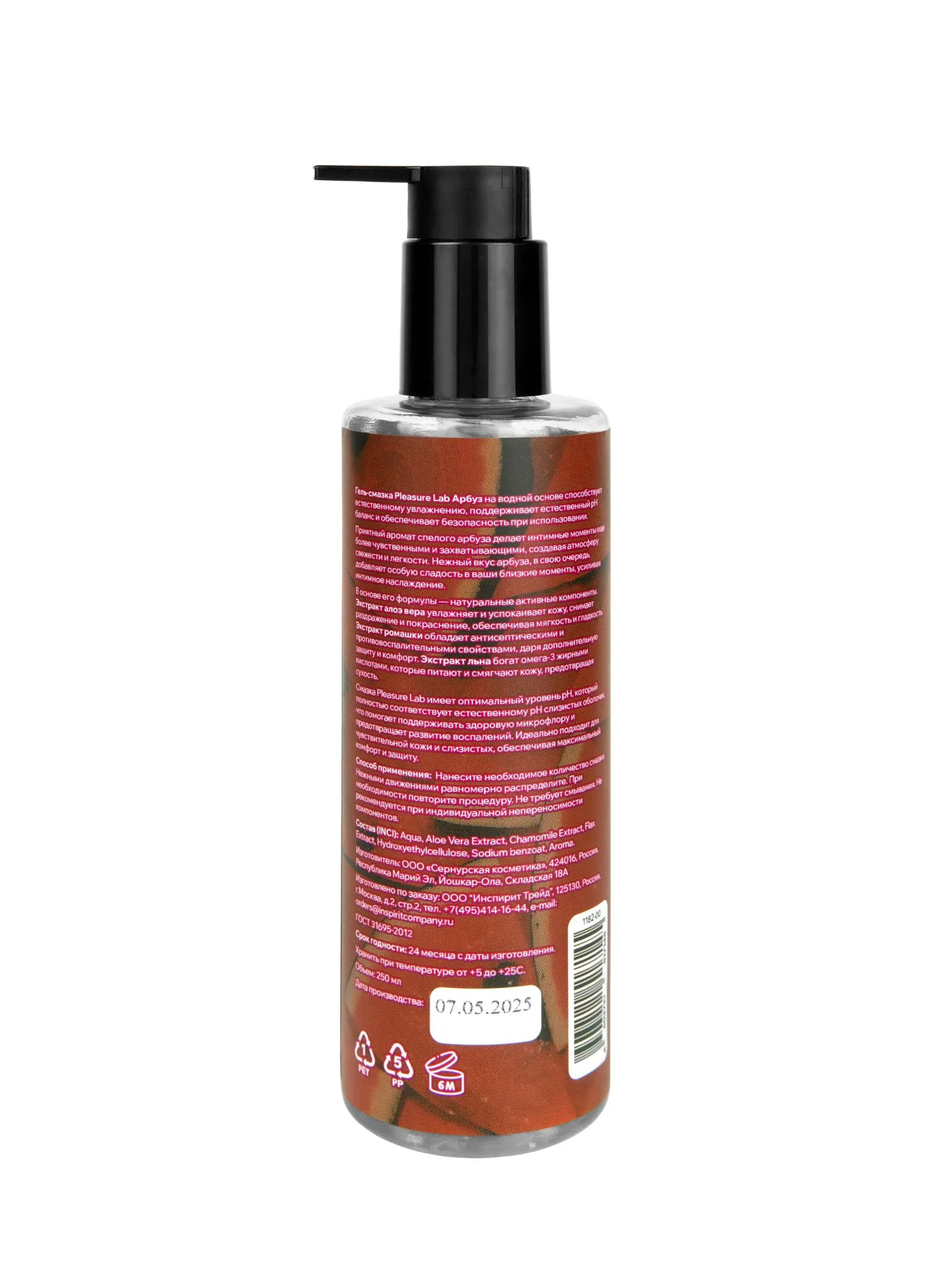 Лубрикант на водной основе Pleasure Lab с сочным ароматом спелого арбуза дарит свежесть и легкость в интимные моменты. Его нежный вкус дополнительно усиливает удовольствие, превращая близость в по-настоящему чувственное наслаждение. Формула основана на натуральных компонентах. Экстракт алоэ вера интенсивно увлажняет и успокаивает кожу, устраняя раздражение. Экстракт ромашки обладает выраженными противовоспалительными свойствами, обеспечивая дополнительную защиту и комфорт. Экстракт льна, насыщенный омега-3 жирными кислотами, глубоко питает и смягчает кожу, предотвращая сухость. Не содержит силиконов, сульфатов, парабенов, красителей и масел. Смазка с оптимальным pH соответствует естественному балансу слизистых, поддерживает здоровую микрофлору и предотвращает воспаления. Идеальна для чувствительной кожи, обеспечивая комфорт и защиту. Состав (INCI): Aqua, Aloe Vera Extract, Chamomile Extract, Flax Extract, Hydroxyethylcellulose, Sodium benzoat, Aroma.