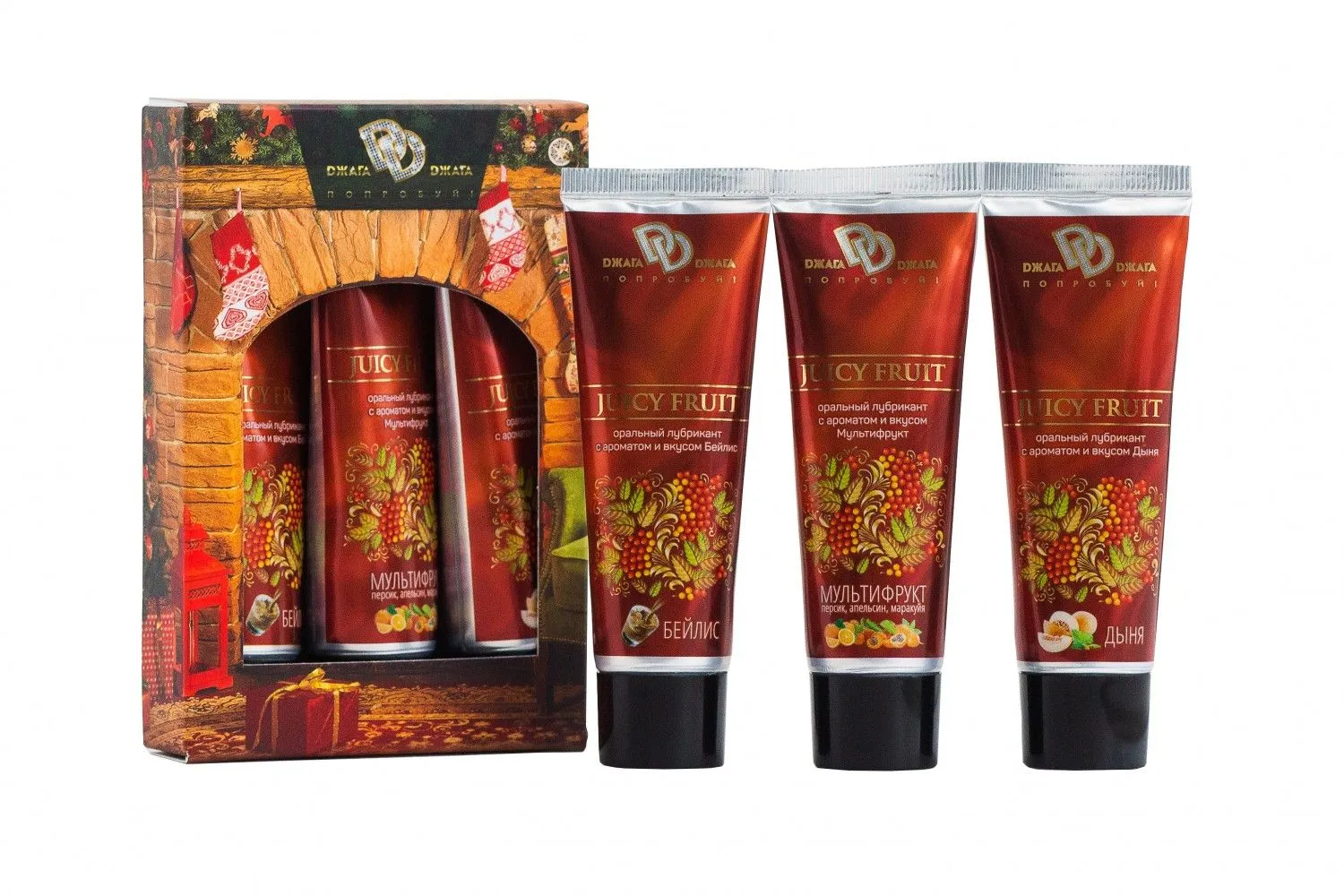 В набор входят три интимные смазки  «JUCY FRUIT» с различными вкусами по 30 мл.