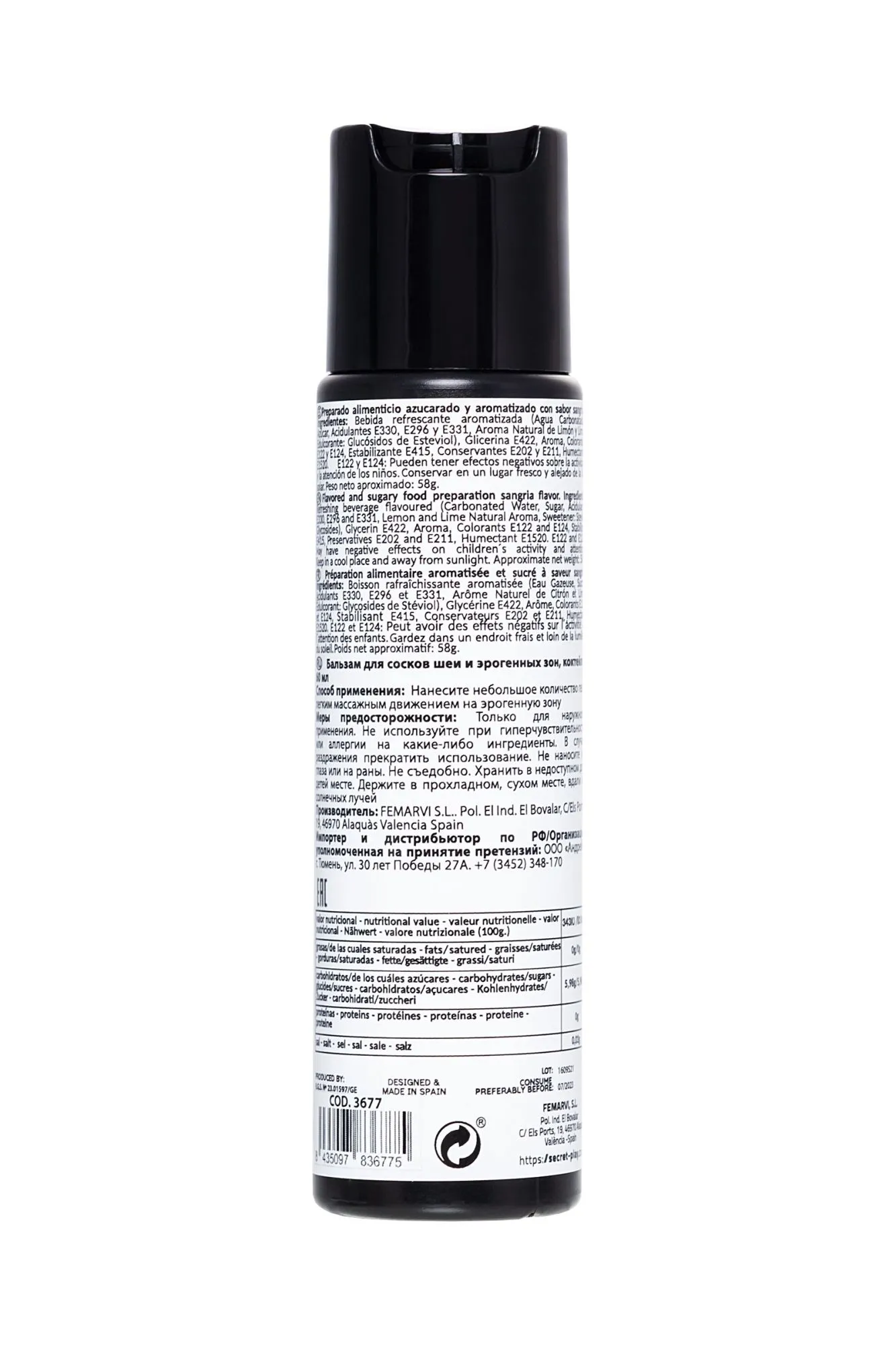 ИНТИМНЫЙ ГЕЛЬ СО ВКУСОМ ПИВА SANGRIA BALM 60 ML "DRUNK IN LOVE" Безалкогольный интимный гель на водной основе от Secret Play серии "DRUNK IN LOVE" Sangria Balm со вкусом сангрии идеально подходит не только для проникновения, но и для оральных ласк и стимулирования эрогенных зон. Необычный, слегка сладкий вкус и аромат дополнят сексуальную игру, с ним путешествовать по телу, облизывая и целуя эрогенные зоны, соски, шею, живот, станет намного интереснее. Кремообразная текстура этого геля обладает превосходными смазочными свойствами. Гель очарует своим восхитительным вкусом и ароматом солнечной сангрии – будет трудно устоять от соблазна совместить любовные игры с этим гелем. Емкость с системой «Disc-Top» Простое нанесение Содержание спирта 0% Объем: 60 мл (58 г) Вкус: сангрия Глицериновая основа Совместимость с презервативами и игрушками Состав: ароматизированный освежающий напиток (газированная вода, сахар, подкислители е330, е296 и е331, натуральный аромат лимона и лайма, подсластитель: стевиоловые гликозиды), глицерин е422, ароматизатор, красители е122 и е124, стабилизатор е415, консерванты е202 и е211, увлажняющий крем. e1520. е122 и е124. Способ применения: Нанесите массирующими движениями на желаемую область. Меры предосторожности: Не используйте при гиперчувствительности или аллергии на какие-либо ингредиенты. В случае раздражения прекратить использование. Не наносите на глаза или на раны. Хранить в недоступном для детей месте. Держите в прохладном, сухом месте, вдали от солнечных лучей.
