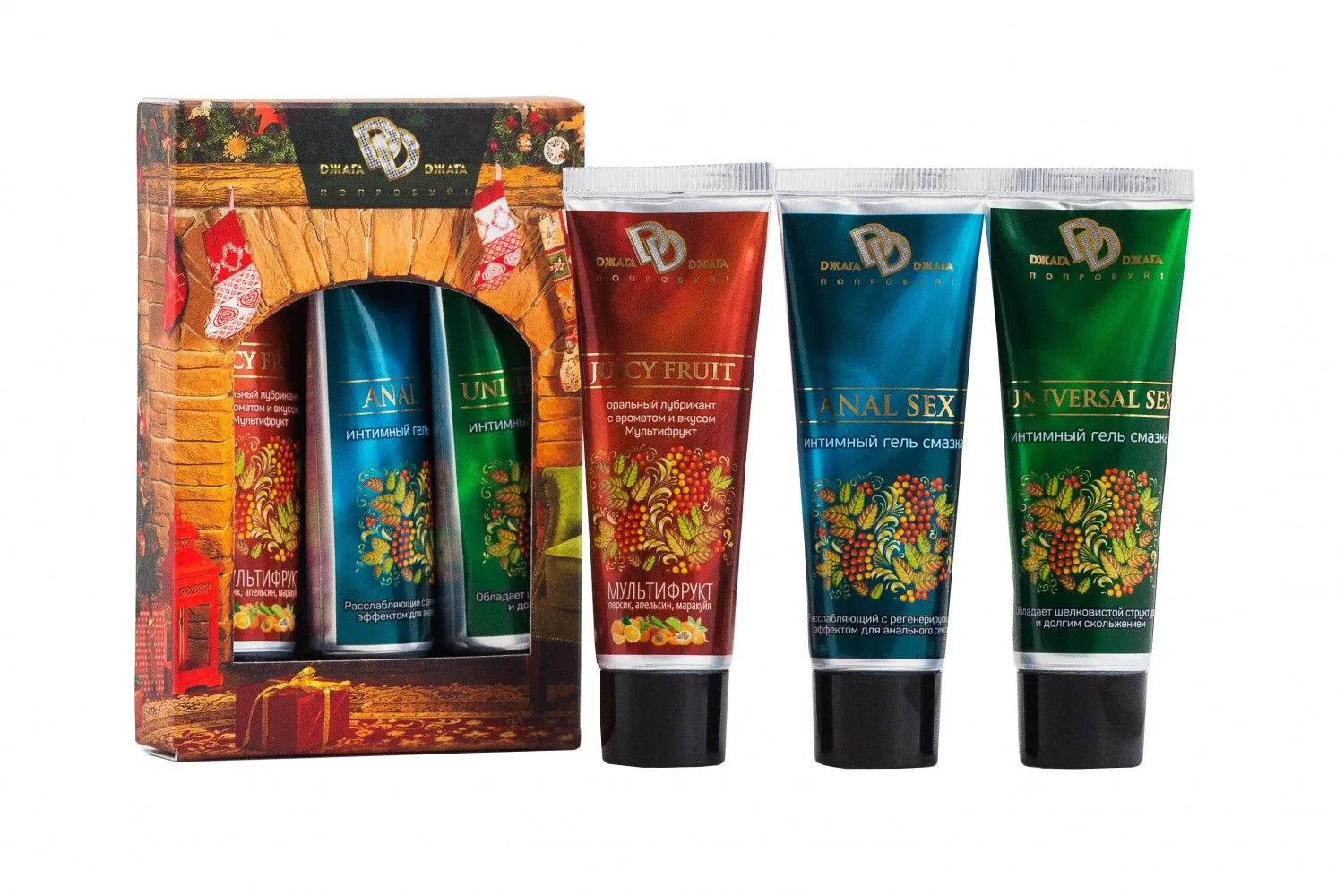 В набор входят три интимные смазки: «ANAL SEX», «UNIVERSAL SEX», «JUCY FRUIT» по 30 мл.