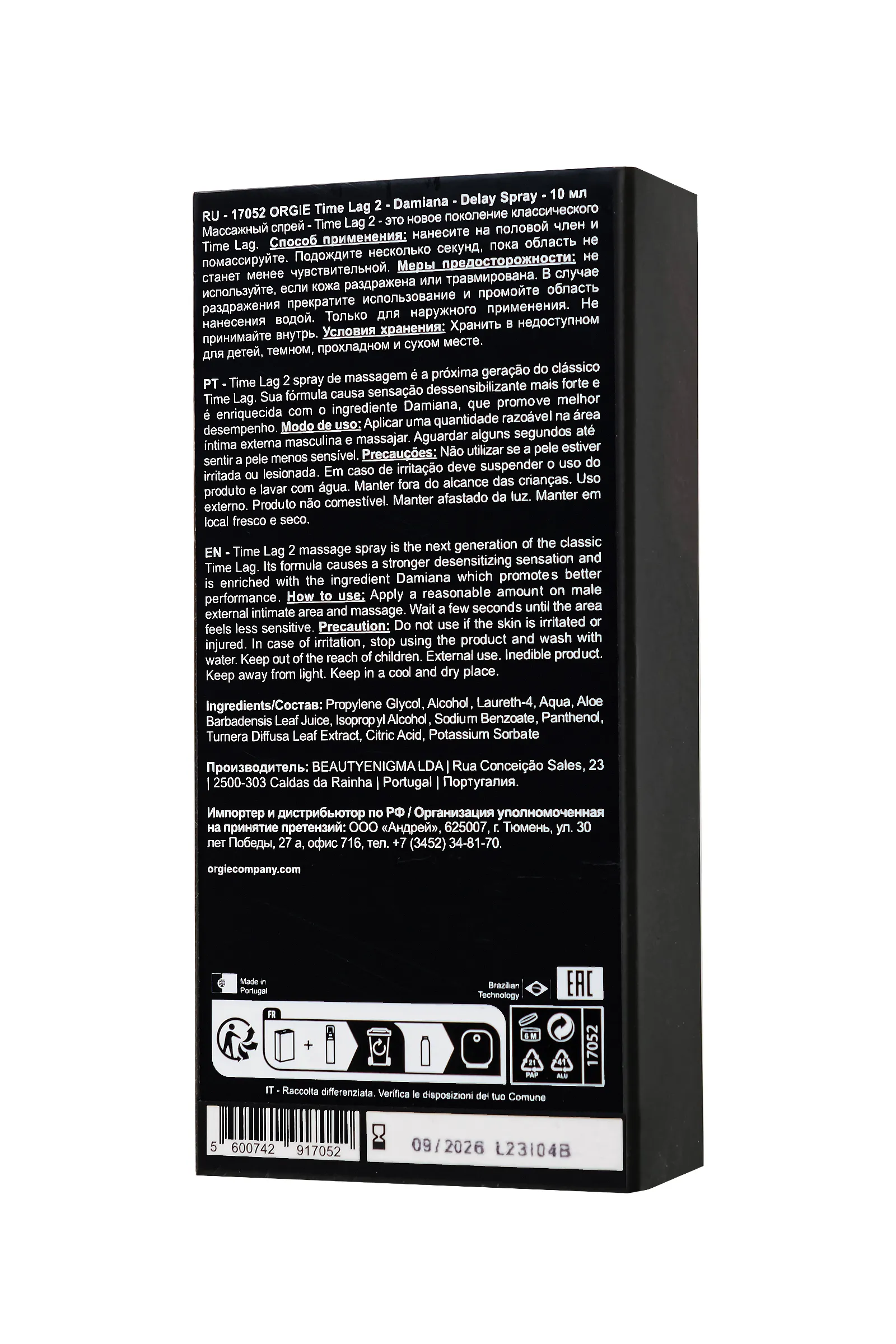 Хотели бы познать искусство продления удовольствия? Тогда это именно то, что вам нужно. Подарите себе незабываемые моменты с продлевающим спреем Time Lag 2 Delay от Orgie, усовершенствованной версией классического спрея Time Lag Delay. Этот продукт разработан специально для тех, кто стремится к более продолжительным и интенсивным ощущениям во время интимных приключений. Формула спрея разработана для деликатного снижения чувствительности, что позволяет продлить интимные моменты и увеличить наслаждение. Обогащенный экстрактом дамианы, известного своими способностями повышать производительность и усиливать половое влечение, этот спрей станет вашим надежным помощником в достижении высшего наслаждения. Натуральные ингредиенты: Time Lag 2 не содержит анестезирующих компонентов, таких как бензокаин и лидокаин, что делает его безопасным и деликатным для использования. Отсутствие анестезирующих веществ гарантирует комфортное использование без побочных эффектов. Эффективное снижение чувствительности: Формула спрея направлена на десенсибилизацию желез полового члена, позволяя контролировать процесс и наслаждаться моментом. Стимуляция и усиление эрекции: Дамиана, входящая в состав, способствует улучшению эрекции и повышению сексуального желания, даря вам новые ощущения. Специальная формула обеспечивает не только продление удовольствия, но и заботу о деликатной коже. Легкость в использовании: Компактный и удобный флакон позволяет легко нанести спрей, обеспечивая комфортное применение в любой ситуации. Стильный флакон идеально впишется в ваш личный арсенал средств для интимного ухода. Способ применения: Для достижения наилучшего результата нанесите 2–3 дозы на половой член и массируйте до полного впитывания непосредственно перед интимной близостью. Подождите несколько секунд, пока область не станет менее чувствительной. При необходимости можно нанести спрей повторно. Time Lag 2 от Orgie идеально подходит для тех, кто стремится продлить моменты близости и наслаждаться каждым мгновением. Этот спрей станет отличным дополнением к вашему ритуалу подготовки к интимной близости, обеспечивая уверенность и комфорт. Orgie – это не просто бренд интимной косметики, это бразильский гимн любви и наслаждению. Продукция Orgie, созданная с использованием натуральных афродизиаков и инновационных формул, пробуждает чувственность и дарит незабываемые ощущения как в интимной близости с партнером, так и в сольном путешествии к самопознанию. Orgie – это философия, призывающая ценить и исследовать все грани интимности, делая каждый момент незабываемым.