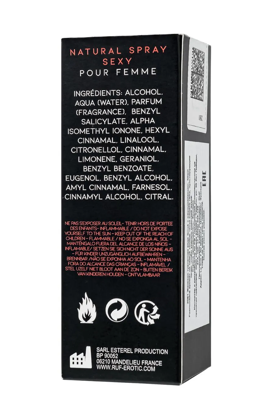 Alcohol, Aqua (water), Parfum (fragrance), Alpha Isomethyl Ionone, Benzyl Benzoate, Benzyl Salicylate, Butylphenylmethyl-proponial, Cinnamal, Citronellol, Eugenol, Geraniol, Hexyl Cinnamal, Limonene