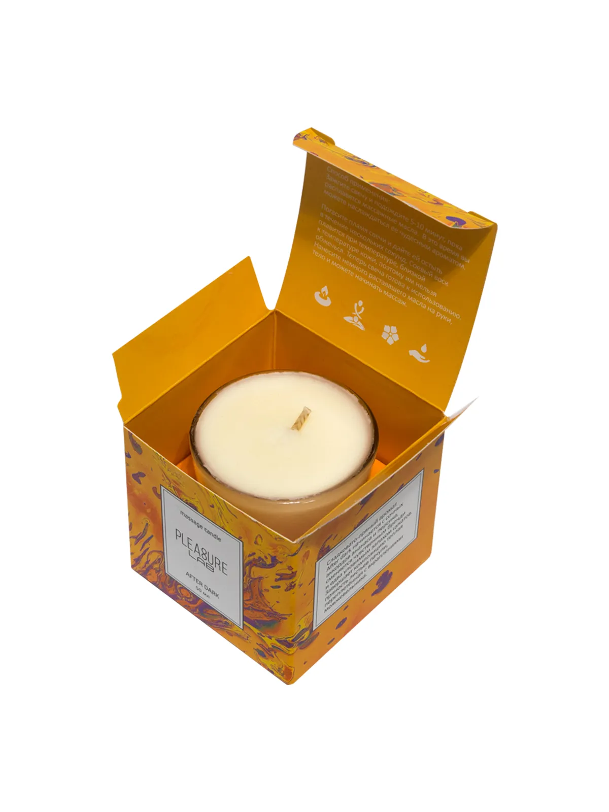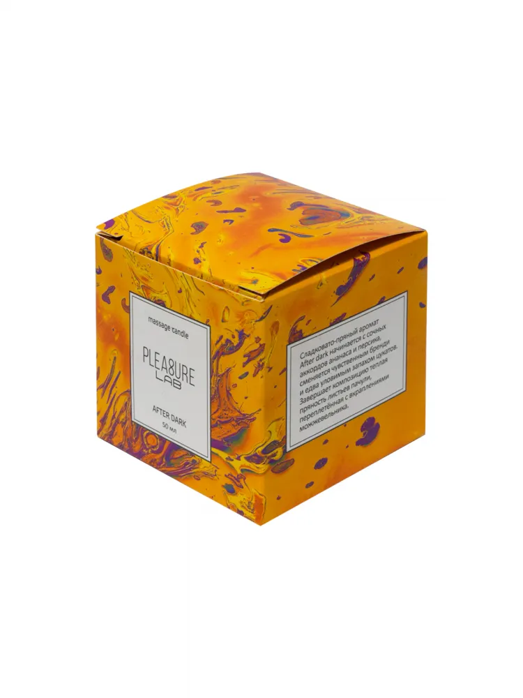 Массажная свеча Pleasure Lab - прекрасный проводник от легких заигрываний до страстного секса. За счет приятного аромата свеча дарит ароматерапевтический эффект, позволяет расслабиться и создать интимную атмосферу. Свеча After dark обладает чувственно-пряным ароматом с аккордами бренди.   Cостав: натуральный соевый воск, натуральные масла: ши (карите), миндальное, кунжутное, виноградных косточек, ароматическая композиция и хлопковый фитиль.   Способ применения: зажгите свечу и подождите 5-10 минут, пока расплавятся массажные масла. В это время вы можете наслаждаться её чудесным ароматом. Погасите пламя свечи и дайте ей остыть в течение нескольких секунд. Соевый воск плавится при температуре, близкой к температуре кожи, поэтому им нельзя обжечься. Теперь свеча готова к использованию. Нанесите немного растаявшего масла на руки, тело и можете начинать массаж. Время горения свечи - 5,5 часов. Условия хранения: хранить в темном месте при температуре от +7 до +20 градусов.