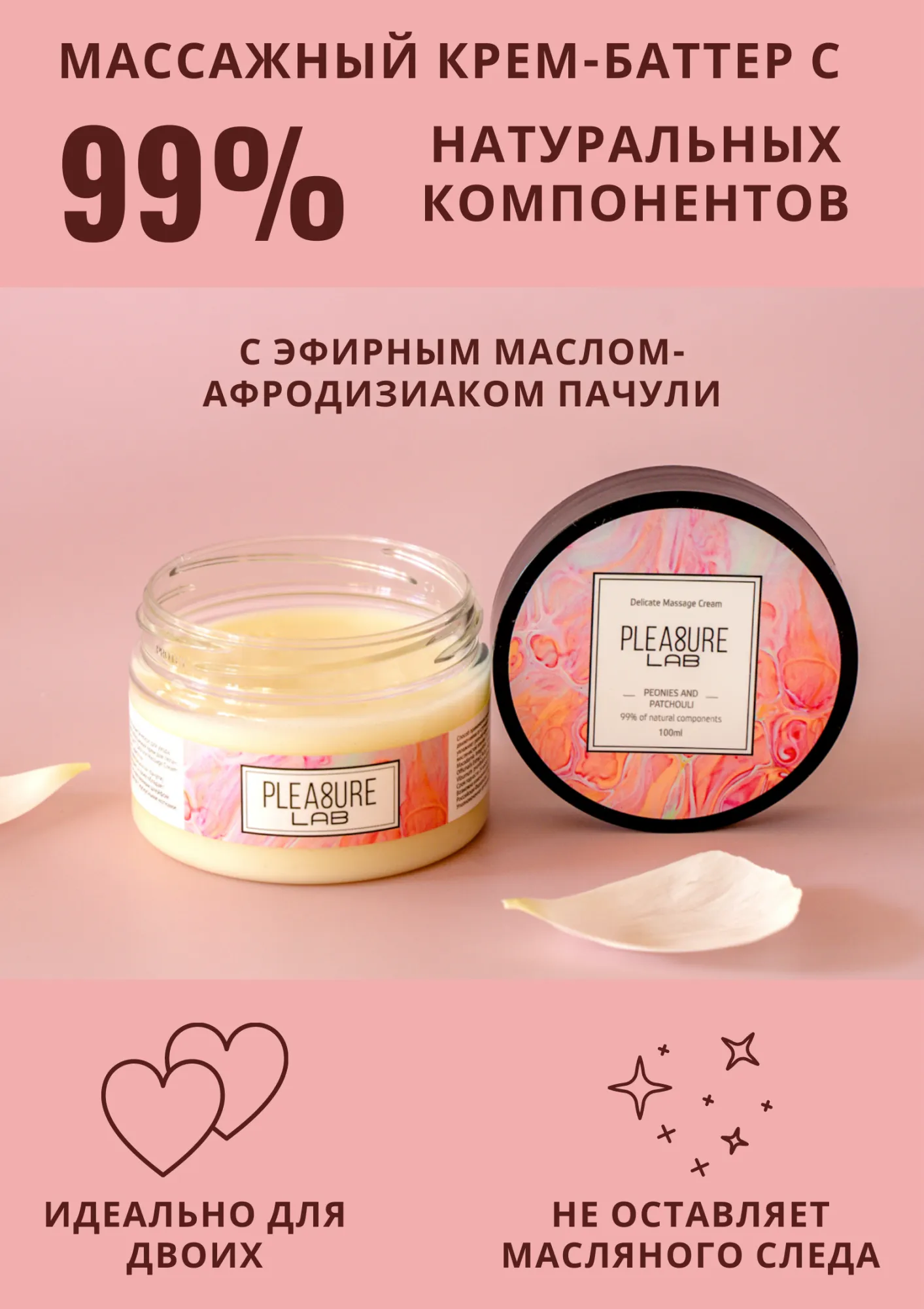 Pleasure Lab Delicate с ароматом пионов и эфирным маслом-афродизиаком пачули умиротворяет, а также обладает легким, но чувственным шлейфом летних цветов с мускусными нотками. Способ применения: разотрите небольшое количество крема в ладонях и медленно начните продвигаться массирующими движениями от ступней к спине и плечам партнера. Массажный крем подходит для самомассажа, а также выравнивает и увлажняет рельеф кожного покрова за счет специальных активных ингредиентов и массирующих гранул, не оставляя маслянистой пленки. Состав: масло ши (карите), масло кокосовое, масло оливковое, масло макадамии, масло зародышей пшеницы, парфюмерная композиция, эфирное масло пачули, СК-СО2 экстракты (розмарин, малина, яблоко, виноград, гранат, калина), натуральный антиоксидант (токоферол (смесь), бета-ситостерол, сквален), витамин Е. Срок годности- 2 года.