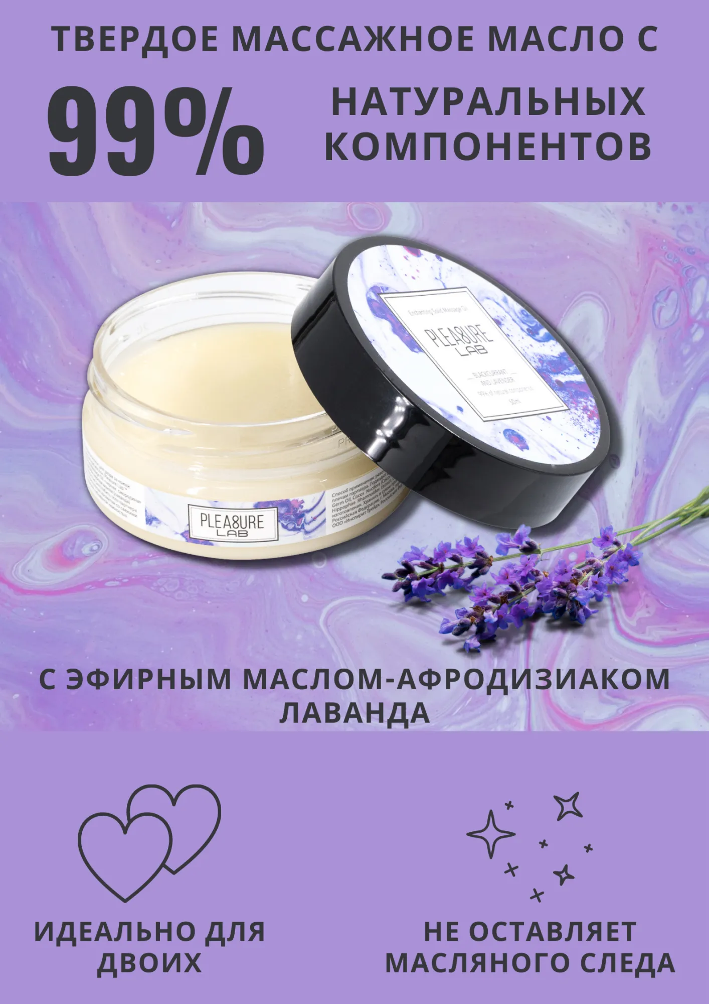 Pleasure Lab Enchanting  с ароматом черной смородины и эфирным маслом-афродизиаком лаванда способно полностью расслабить тело партнера и очаровать изысканным ароматом со свежими нотками, одаривая небывалой нежностью. Способ применения: разотрите небольшое количество масла в ладонях и медленно начните продвигаться массирующими движениями от ступней к спине и плечам партнера. Подходит для самомассажа.  Состав: масло ши (карите), миндальное масло, масло зародышей пшеницы, масло кокосовое, воск рисовых отрубей, парфюмерная композиция, эфирное масло лаванды, СК-СО2 экстракты (розмарин, лимон, облепиха, календула), натуральный антиоксидант (токоферол (смесь), бета-ситостерол, сквален), витамин Е. Срок годности- 2 года.