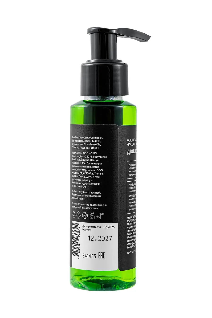 Формула на основе масел оливы, сладкого миндаля, макадамии и зародышей пшеницы глубоко питает и увлажняет кожу, делая её гладкой и шелковистой. Экстракты имбиря и стручкового перца активируют лёгкое согревающее действие, усиливая чувствительность. Масло мяты и иланг-иланга дополняют композицию, тонизируя и создавая расслабляющий ароматический фон.