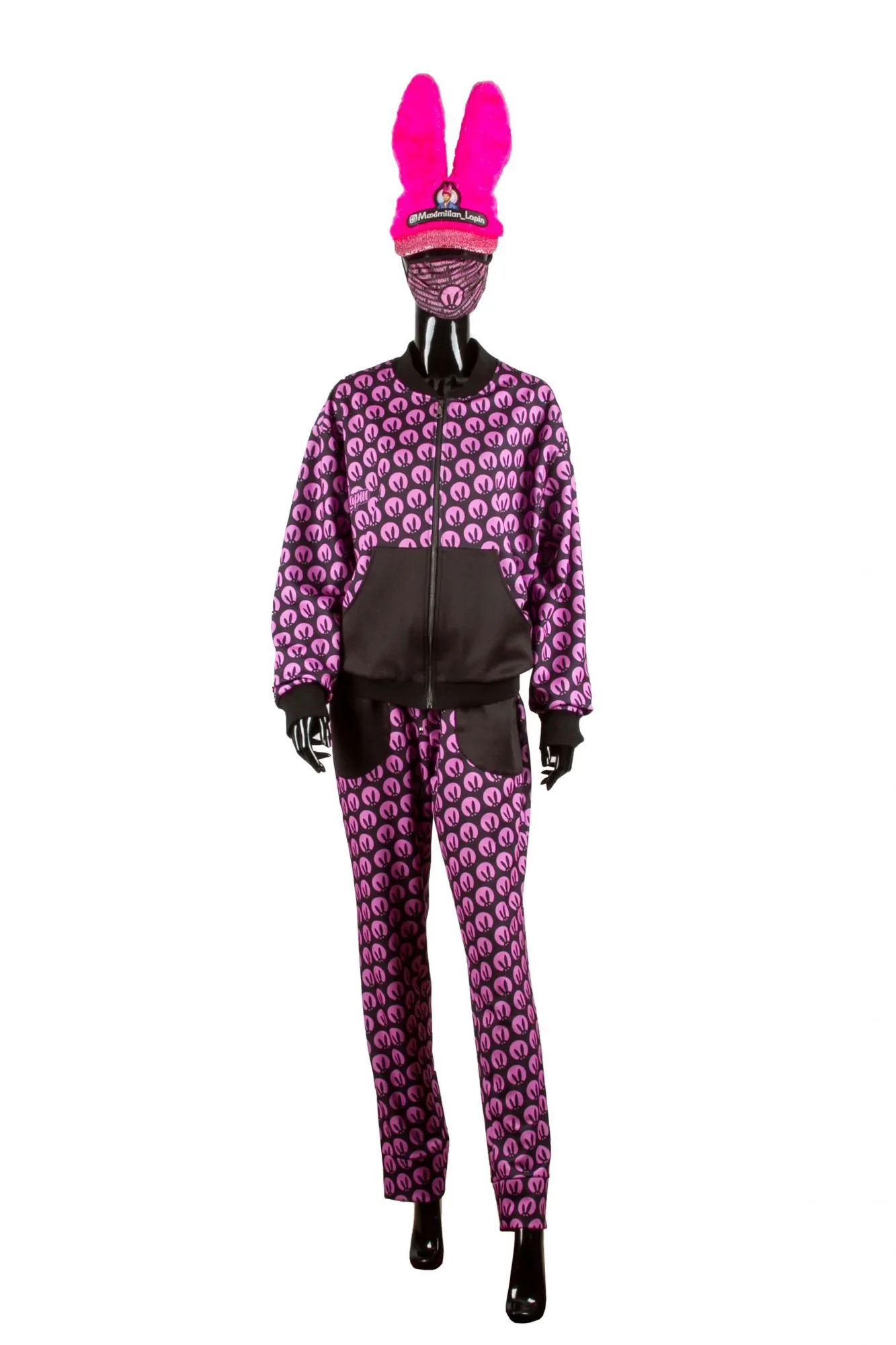 Стильный чёрный костюм с оригинальным розовым принтом от "Pink Rabbit" - это стильное решение на каждый день.Состоит из легкой толстовки на молнии и штанов. Наш фирменный принт делает костюм единым целым и подчеркивает вашу индивидуальность. Для домашнего вечера идеально подойдёт мягкий и гладкий материал костюма. А любители спорта оценят эластичные, не стесняющие движений резинки. Легко стирается и не мнётся, сохраняет форму и не растягивается. Стойкий цвет надолго оставит костюм таким же ярким, как и в первый день покупки.