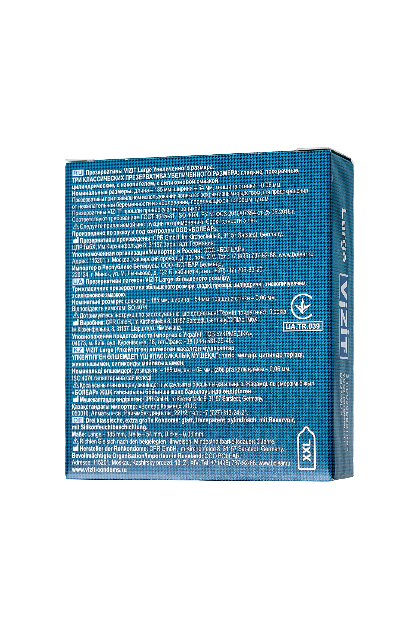 Презервативы VIZIT Large Увеличенного размера, латекс, 18,5 см Невероятно, но факт! Большинство мужчин, имеющих средний размер достоинства, покупают презервативы VIZIT Large увеличенного размера и чувствуют себя превосходно! Благодаря эластичности презерватив комфортно располагается на пенисе среднего и выше среднего размера – никакого ощущения дискомфорта или сдавленности – тот случай, когда размер имеет значение. Представьте, как приятно удивится девушка, когда вы откроете упаковку с презервативами VIZIT Large. Отдайтесь сладкому вожделению с головой, не думая о безопасности, с презервативами VIZIT Large. Цилиндрическая форма контрацептивов с накопителем из эластичного латекса дарят уверенность в надежности и защите от нежелательных факторов. Попробуйте всю линейку презервативов VIZIT, чтобы найти свой идеальный контрацептив. Лаконичный дизайн в виде пиджака и галстука, на котором изображен вид презервативов, легко поможет сделать выбор из широкого ассортимента контрацептивов VIZIT. Стильная упаковка и европейское качество презервативов VIZIT по привлекательной цене для вашего удовольствия. Эластичные – прочные и надежные Безопасные – натуральный латекс Силиконовая смазка – обеспечивает комфортный половой акт Увеличенного размера – 190 мм длина, 54 мм ширина Нейтральный запах – не отвлекает Количество штук в упаковке: 3 шт. Количество штук в упаковке: 12 шт