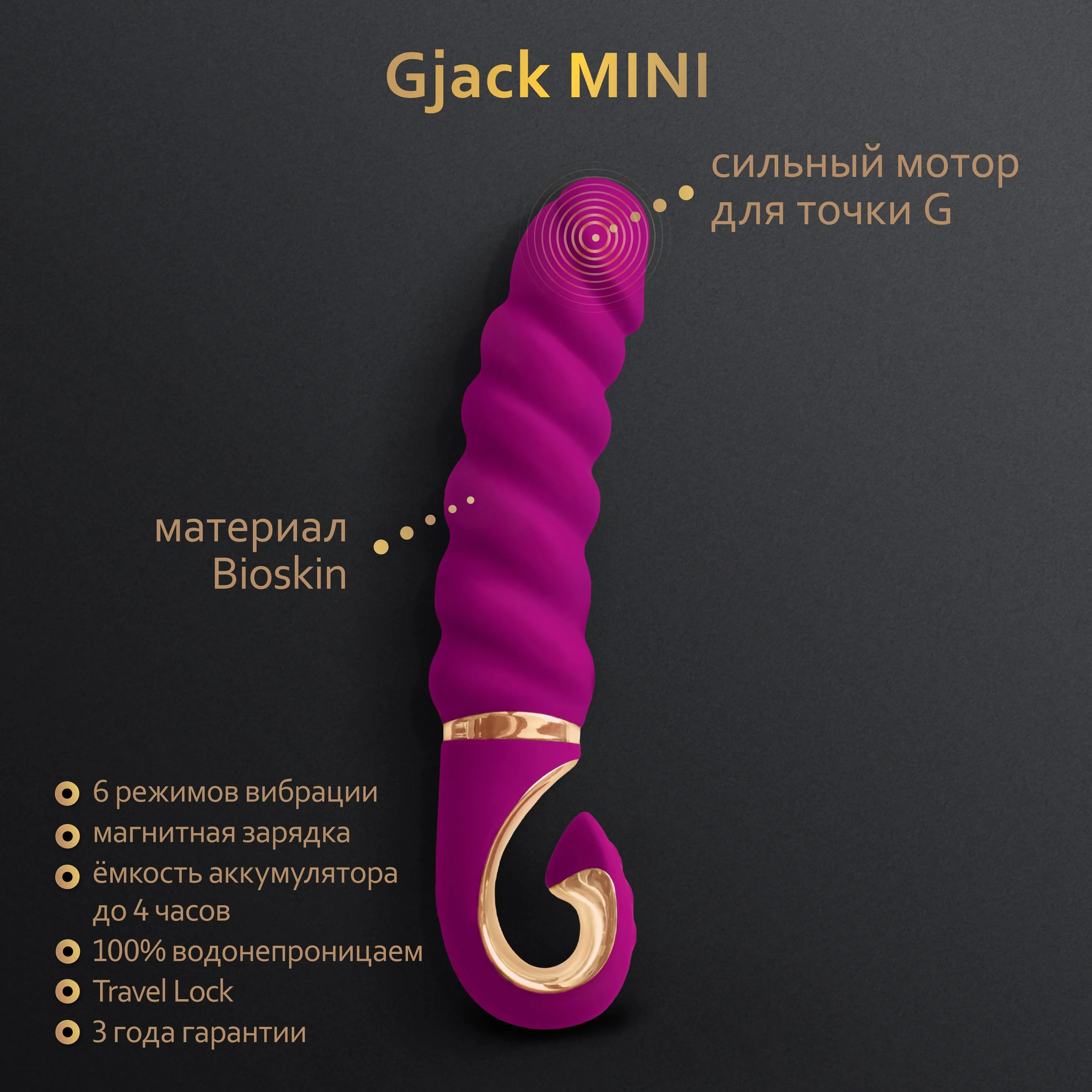 GJaсk Mini от знаменитых великобританцев Gvibe. Все тот же невероятный материал Bioskin, это премиум-класс среди материалов игрушек! Очень мощный, но тихий мотор и шесть режимов вибрации с изменяемой интенсивностью - от легкой, дразнящей, до сильных оргазмических толчков - его вибрация проходит по всей длине ствола...