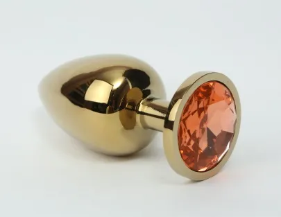 Анальная пробка из металла под золото с ярким кристаллом  внесет разнообразие в вашу интимную жизнь. Обладает сглаженной  формой, что позволяет обеспечить легкое введение и комфортное длительное ношение.  Снабжена ограничительным основанием для безопасного использования.  Характеристики:  Общая длина 8,2 см, рабочая длина 7 см, наибольший диаметр: 3,4 см., вес 95 гр. Упаковка: индивидуальный тканевый мешочек и коробка.