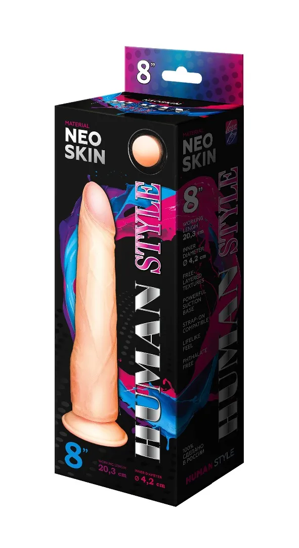 Реалистичный фаллоимитатор телесного цвета. Имеет форму члена с ярковыраженной головкой. Необычайно приятный, рельефный, выполненный из материала «Неоскин» , передающий эффект мягкой реалистичной текстуры кожи, не имеет швов. В основании имеется отличная присоска. Характеристика: общая длина – 20,8 см, рабочая длина- 20,3 см, максимальный диаметр- 4,2 см. Упаковка- картонная коробка с принтом.