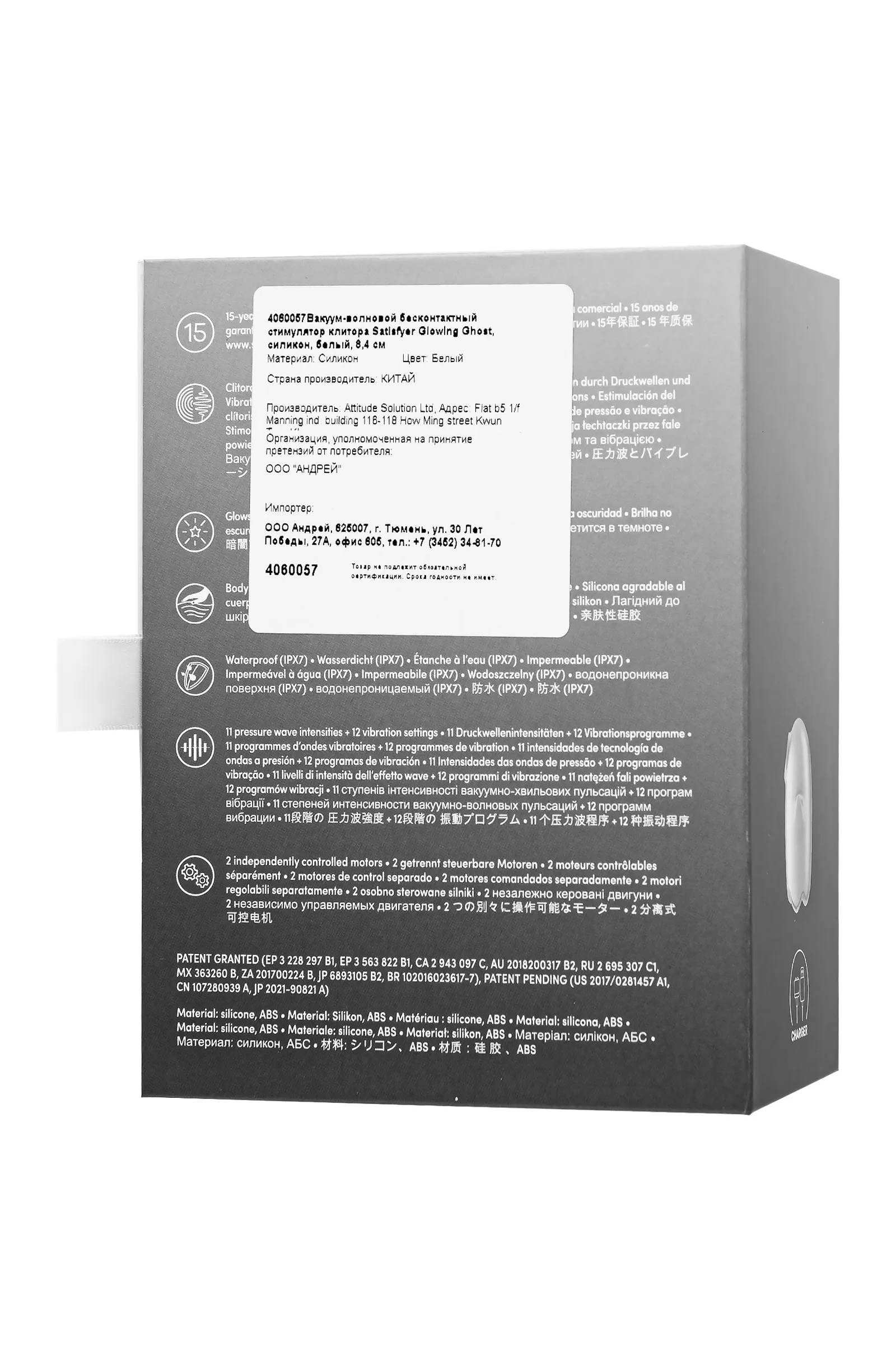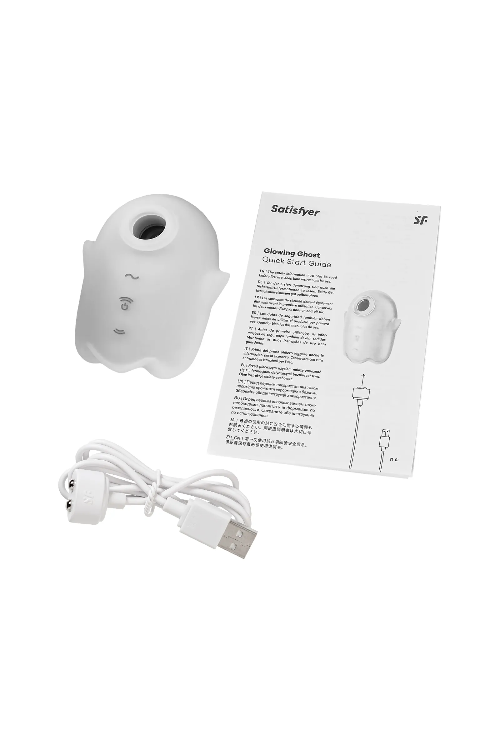 Хочешь добавить перчинки в интимную игру? Glowing Ghost от Satisfyer – это не просто секс-игрушка, это милый и забавный призрак, который станет твоим новым лучшим другом в мире удовольствий. Клиторальный вакуумно-волновой стимулятор с вибрацией обещает доставить вам волны экстаза. Технология Air Pulse использует вакуумные волны для бесконтактной стимуляции клитора, обеспечивая интенсивные и волнующие ощущения. С 11 уровнями интенсивности и 12 программами вибрации, вы сами выбираете силу и ритм стимуляции, настроив их под свои предпочтения. Эргономичный дизайн стимулятора удобно ложится в вашу руку. Шелковистое силиконовое покрытие – фирменный знак Satisfyer. Безопасный медицинский силикон приятен на ощупь и адаптируется к температуре вашего тела. Благодаря флуоресцентному силиконовому слою этот стимулятор светится в темноте, поэтому он точно не затеряется под простынями.... Glowing Ghost имеет уровень влагозащиты IPX7 – можно погружать под воду до 30 минут. Перезаряжается с помощью магнитного USB-кабеля, что обеспечивает удобство использования и долговечность. Для максимального удовольствия и сохранения материала в отличном состоянии рекомендуем использовать качественную смазку на водной основе. После использования легко очистить игрушку теплой водой со специальными бактерицидными спреями для интимных товаров. Glowing Ghost - это идеальный выбор для тех, кто хочет: Попробовать что-то новое и веселое. Добавить изюминку в свою интимную жизнь. Побаловать себя необычным и забавным гаджетом. Особенности: Мягкий силикон белого цвета, приятный на ощупь, будто обнимаешь призрака из любимого мультфильма. Вакуумные волны, которые щекочут и массируют ваш клитор, будто призрак-невидимка. 11 уровней интенсивности и 12 программ вибрации, чтобы вы нашли свой идеальный режим. 2 моторчика, которые удивят вас двойной волной удовольствия. Светится в темноте, делая ваши интимные игры еще более загадочными и волнующими. Возможность использовать игрушку в ванной и душе благодаря полной водонепроницаемости (до 30 минут на глубине до 1 метра) – IPX7. Перезаряжаемый, магнитный USB-кабель.