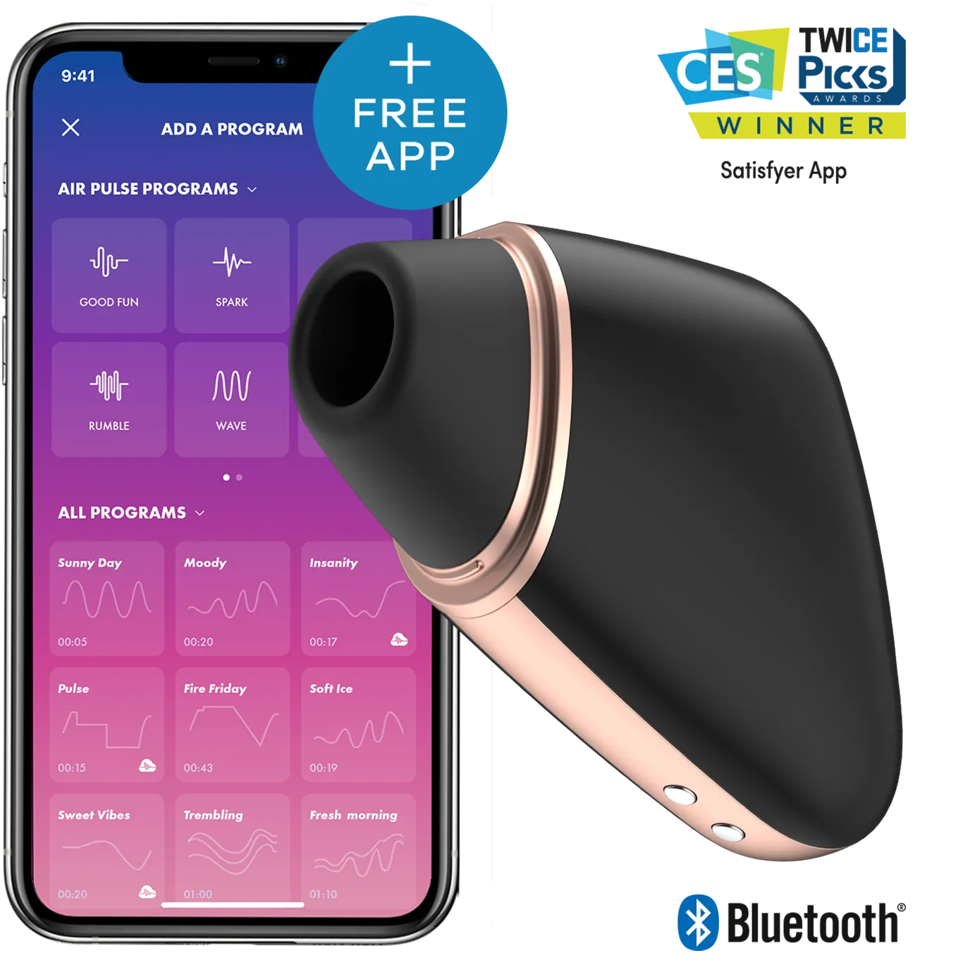 SВакуумный вибромассажер Satisfyer Love Triangle сочетает в себе функции вибратора и вакуумного стимулятора. Имеет 10 режимов вибрации и 11 режимов вакуумной стимуляции, которые могут работать как вместе, так и раздельно. Работает от аккумулятора, и заряжается от магнитного зарядного устройства (идет в комплекте). Вакуумный стимулятор оснащен системой Bluetooth, и управление может осуществляться через бесплатное мобильное приложение Satisfyer, либо кнопками на устройстве. Общая длина стимулятора составляет 10 см. Внутренний диаметр насадки- 1,5 см. Водонепроницаемый, соответствует международным стандартам IPX7.