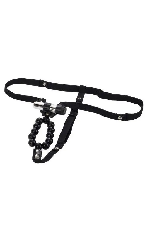 Vibrating Lover's Thong With Stroker Beads – стимулятор в виде трусиков-стригнов с бусинами в районе половых органов и вибрацией. Входящая в комплект, перезаряжаемая вибропуля может использоваться как в комплекте, так и самостоятельно. Трусики изготовлены из эластичного, хорошо растягивающегося нейлона. А стимулирующие бусины и вибропуля из безопасного, несодержащего фталатов АБС-пластика.
