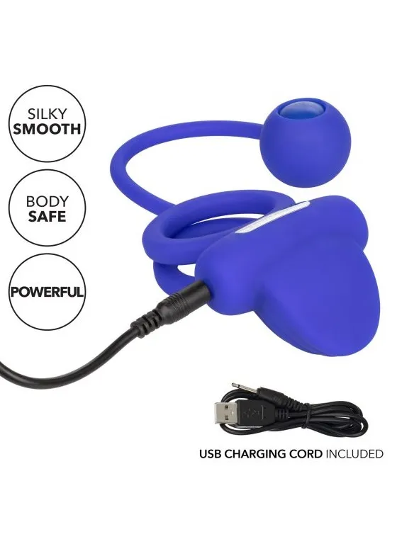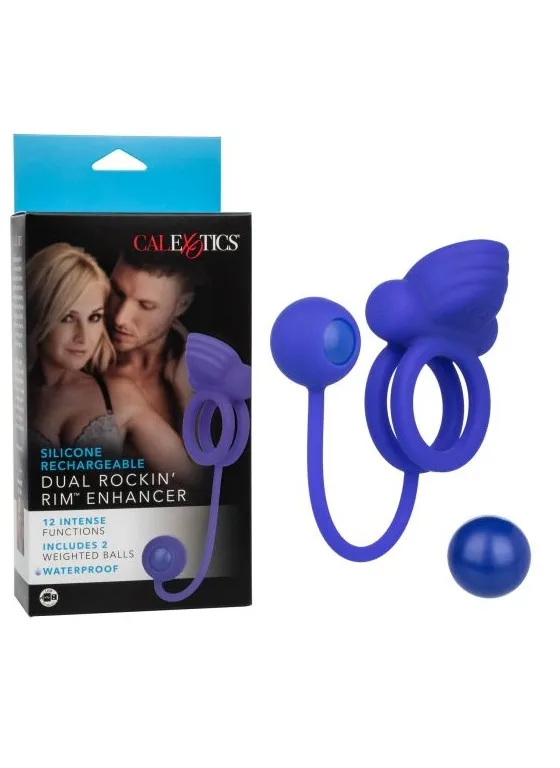 Silicone Rechargeable Dual Rockin' Rim Enhancer – перезаряжаемое двойное кольцо соединенное эластичным шнуром со сменным утяжеленным шаром, предназначенное для поддержания эрекции и стимуляции. Оно изготовлено из эластичного, мягкого силикона, что обеспечивает не только растягивание до нужного размера, но и приятные тактильные ощущения. Кольцо имеет двойную структуру для фиксации на стволе пениса и/или дополнительно на мошонку. Встроенная вибропуля обеспечивает 12 функций вибрации, пульсации и эскалации.