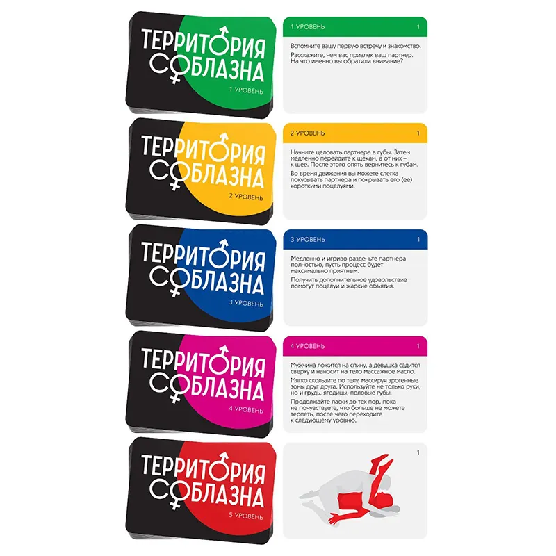 Осторожно! Вы вступили на территорию соблазна «Территория соблазна» – это серия эротических игр для двоих, в основе которой лежит акцент на раскрепощения. Разговоры, лёгкие прикосновения, пикантные фанты, прелюдия к сексу и постепенный переход к самому главному – сексу. Серия включает в себя наборы с аксессуарами, карточные игры, наборы кубиков и т.д.