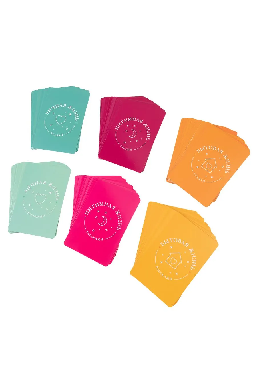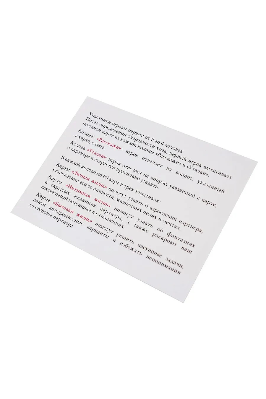 После определения очередности хода, первый игрок вытягивает по одной карте из каждой колоды «Расскажи» и «Угадай». Колода «Расскажи»: игрок отвечает на вопрос, указанный в карте, о себе. Колода «Угадай»: игрок отвечает на вопрос, указанный в карте, о партнере и старается правильно угадать. Карты «Личная жизнь» помогут узнать о взрослении партнера, становлении его/ее личности, жизненных целях и мечтах. Карты «Интимная жизнь» помогут узнать об фантазиях и скрытых желаниях партнера, а также раскроют ваш сексуальный потенциал в отношениях. Карты «Бытовая жизнь» помогут решить насущные задачи, найти компромиссные варианты и избежать непонимания со стороны партнера.