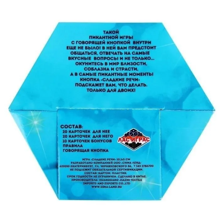 Эта игра для двоих с пикантной говорящей кнопкой поможет Вам не только приятно провести время вдвоем, но и также получше узнать друг друга. По очереди тяните карточки из двух колод и отвечайте на различные откровенные вопросы. Помимо обычных карт с вопросами в колодах есть бонусные карты, после вытягивания которых надо нажать на кнопку и получить задание. Такая игра поможет вам раскрепоститься и узнать все сокровенные желания и тайны друг друга.