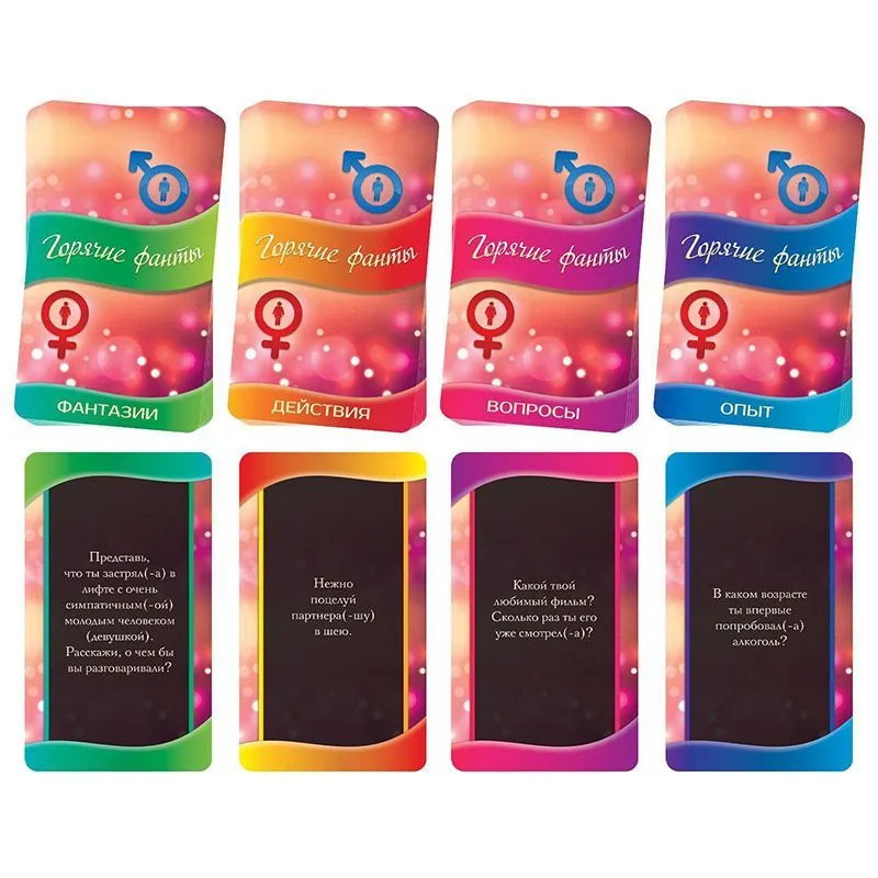 Перед вами четыре колоды карт. Выполняйте все задания последовательно, пока в каждой колоде не закончатся фанты! Отвечайте на вопросы, делитесь опытом и фантазиями, а затем переходите к более решительным действиям. Вытягивайте карточки и ловите каждое мгновение, ведь это так важно — узнавать друг друга в самом начале отношений.