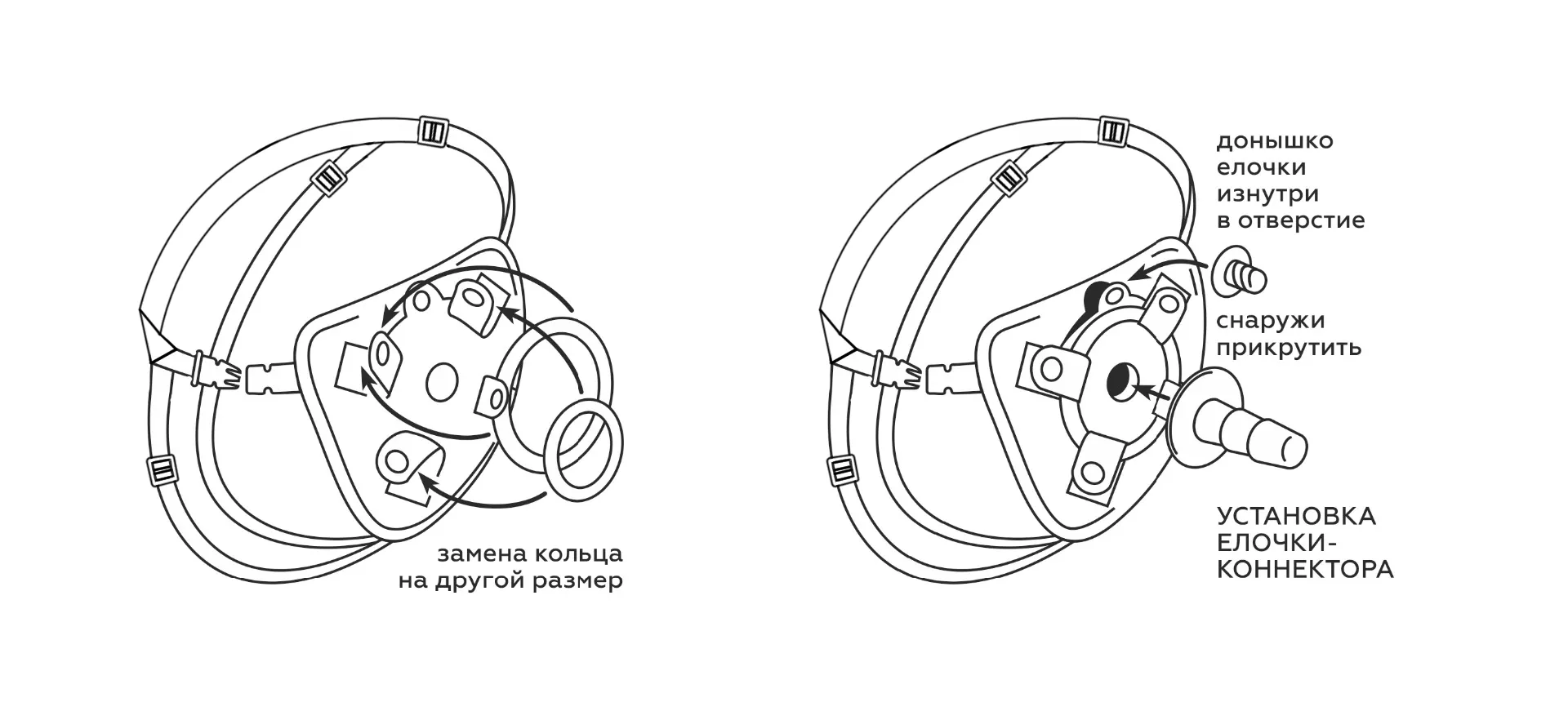 Пояс состоит из передней части в виде треугольника, на котором устанавливаются 2 типа коннекторов (фиксаторов). Один фиксатор в виде кольца (3 размера колец можно докупить отдельно). Другой - в виде пластикового штырька, раскручивающегося на две детали. Одна деталь - сделана в виде шайбы и резьбового соединения, другая – в виде «елочки» цилиндрической формы. В поясе есть кармашек с кнопкой и отверстие, в которое помещается деталь в виде шайбы, резьбой в отверстие. Затем с внешней стороны прикручивается вторая деталь «штырек - елочка». Можно зафиксировать кольцом практически любой фаллоимитатор на присоске. Для смены колец необходимо расстегнуть кнопки ремней вокруг отверстия и поставить подходящее по размеру эластичное кольцо. На поясе есть два пришитых узла для прикрепления ремней и их регулировки по длине и натяжению.